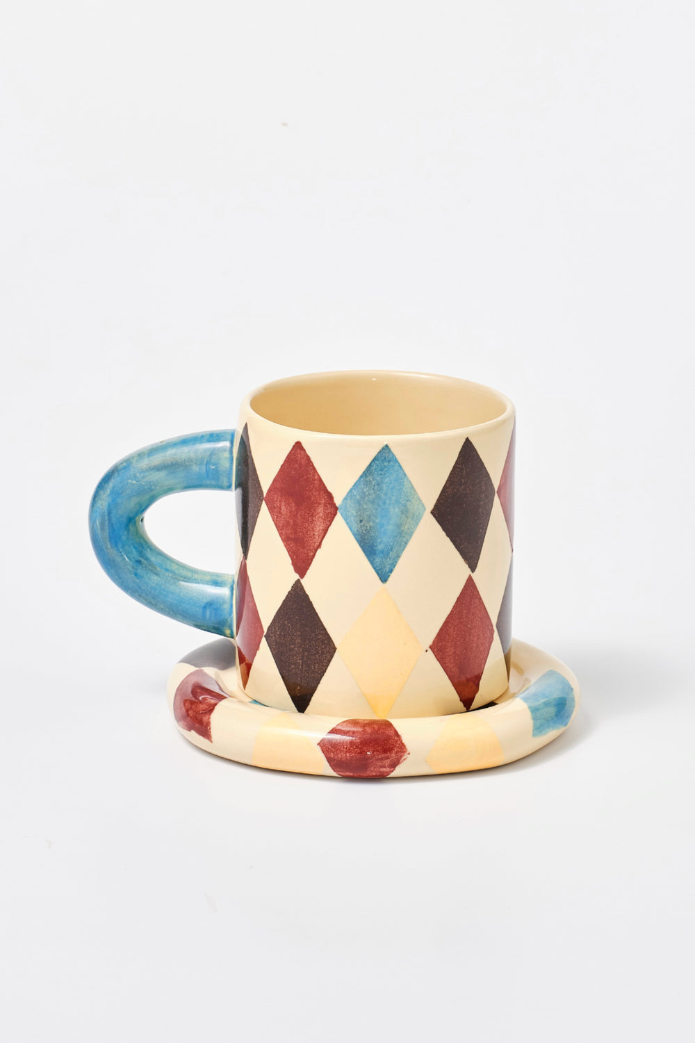 Designed in London and hand-painted with intricate detail, the Hand-Painted Harlequin Mug brings charm to every sip. Featuring a contrast blue handle and an all-over harlequin design, this ceramic mug is both unique and timeless. Measuring Diameter 9.5cm x Height 10cm, it’s the perfect blend of function and artistry. Please note all ceramics can only be shipped within the UK.