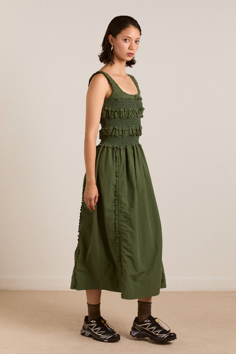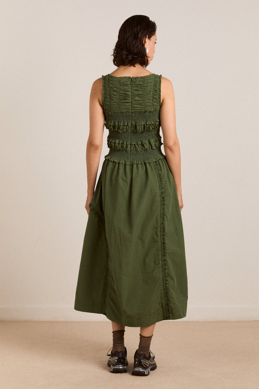 This Cynthia midi dress is cut with a soft scoop neck and shirred bodice detail for a flattering, throw on fit. The sleeveless shape keeps things easy, while the ruffled hem and adjustable toggles let you ruche the skirt as high (or low) as you like. It's lightweight, breathable, and built to move with you. Designed in London, made in Turkiye, and fits true to size - but if you're between, we suggest sizing up.