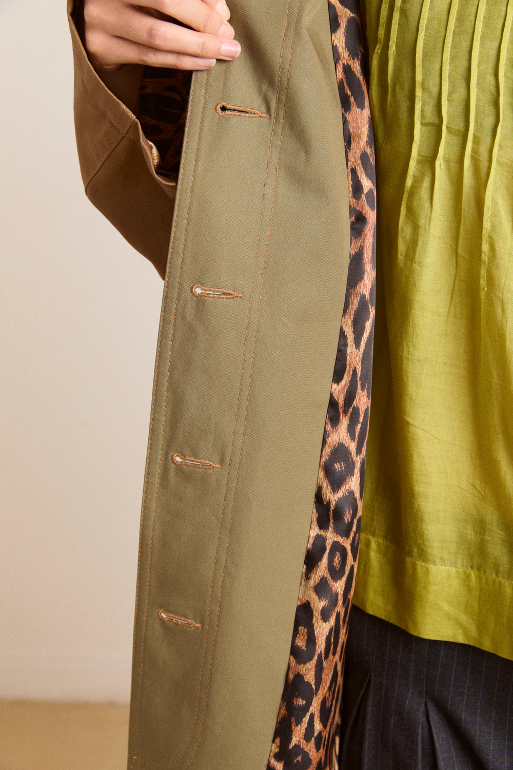 If you're shopping for cooler summer evenings, or looking ahead to transitional seasons, our Camille trench could be the ideal addition to your wardrobe. This lightweight, a-line coat features welt pockets, signature DM embroidery at the neck and a leopard print lining with internal pockets.