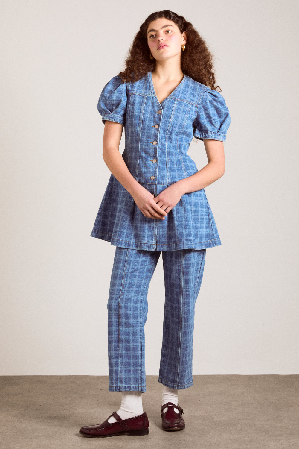 Using waterless laser technology, laser check details adorn the Adeline Shell Denim Mini Dress. Featuring puff sleeves, functional buttons and our signature DM embroidery detail on the back neckline, the Adeline will effortlessly take you from day to night.