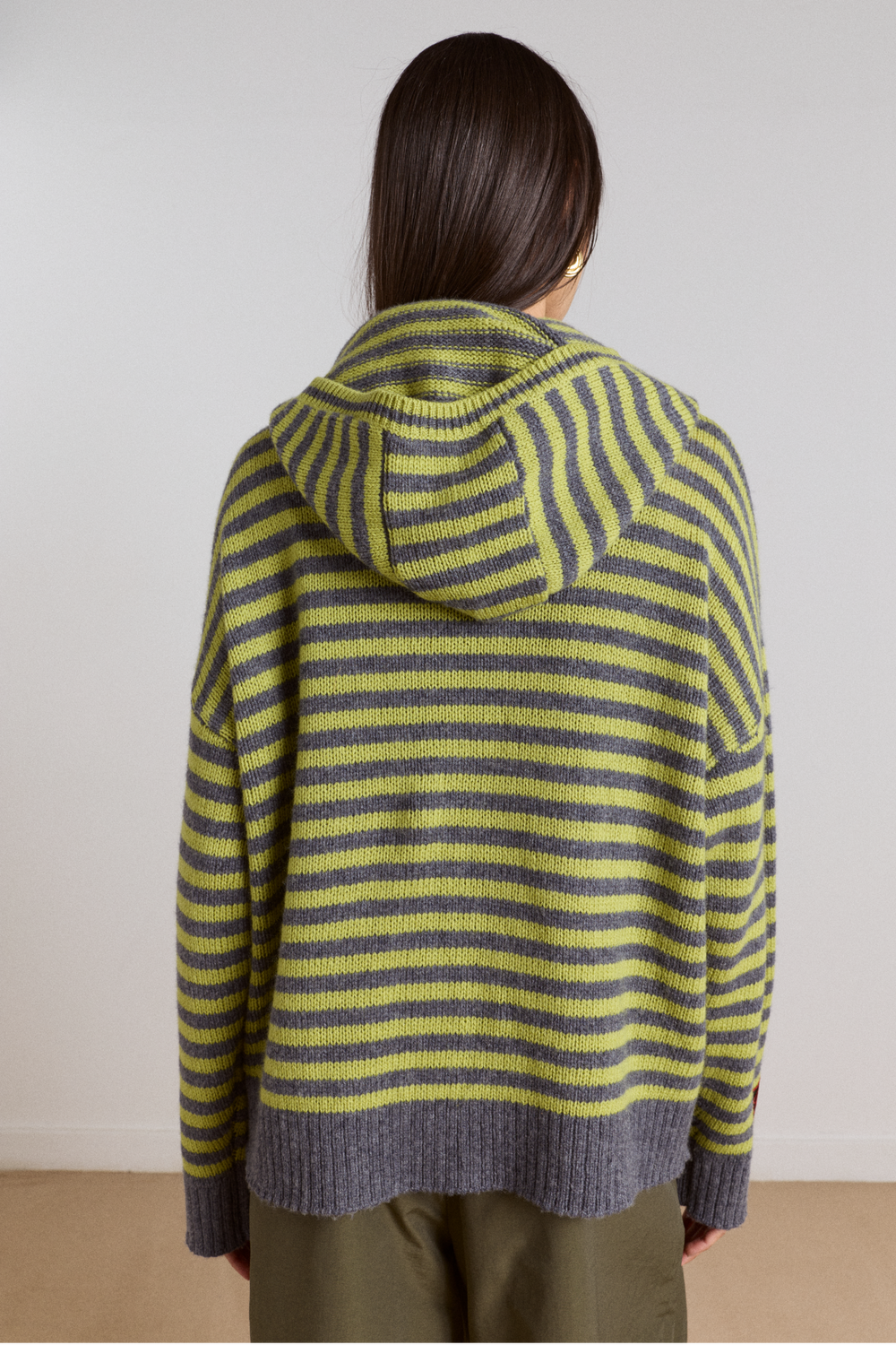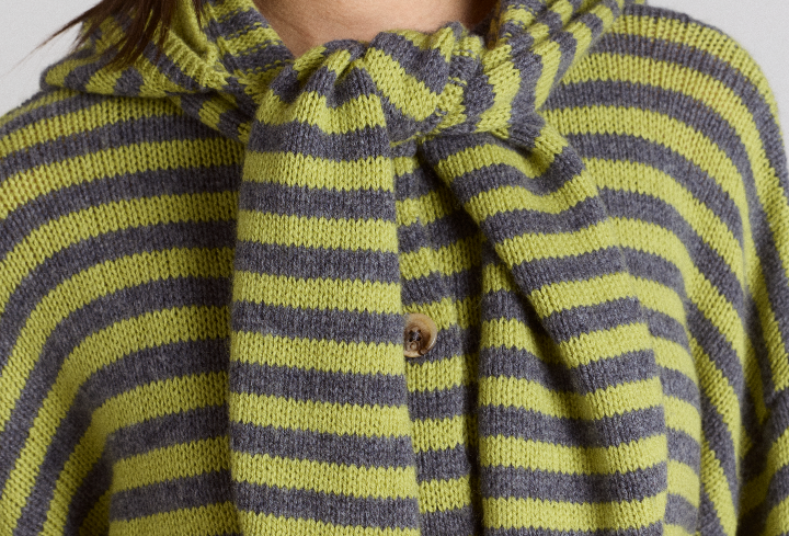 An oversized cardigan designed with a removable hood for flexible styling. Features an all-over stripe pattern and subtle branding at the cuff. Made from 100% Responsible Wool Standard Merino Wool.