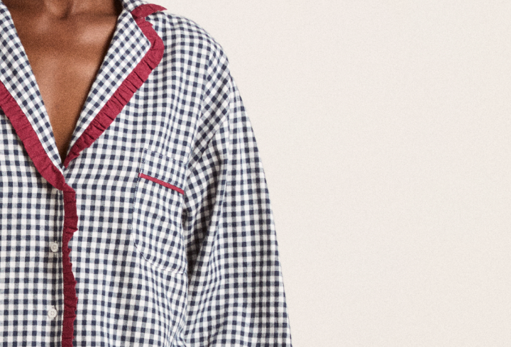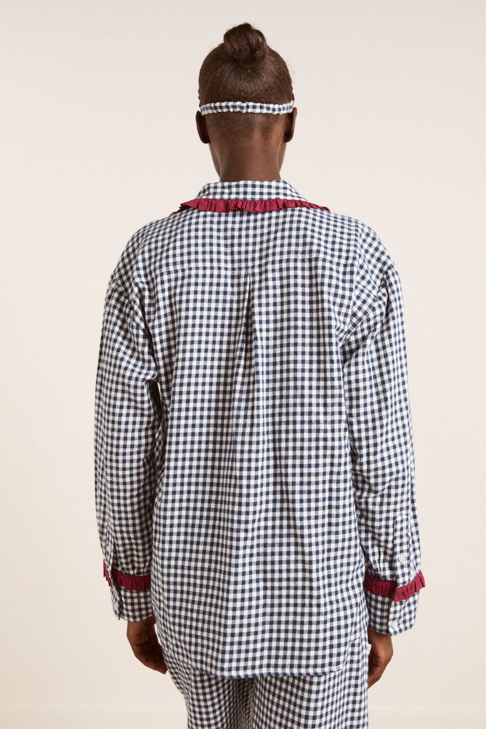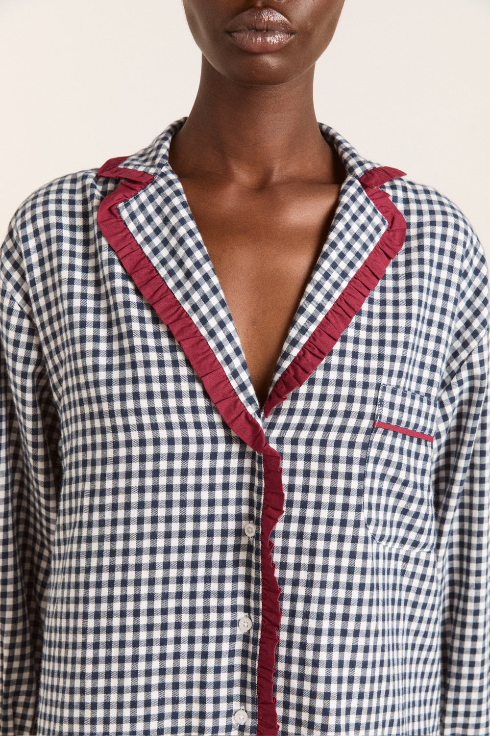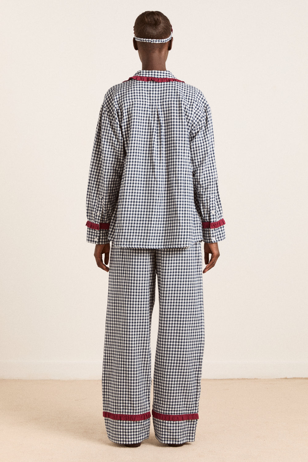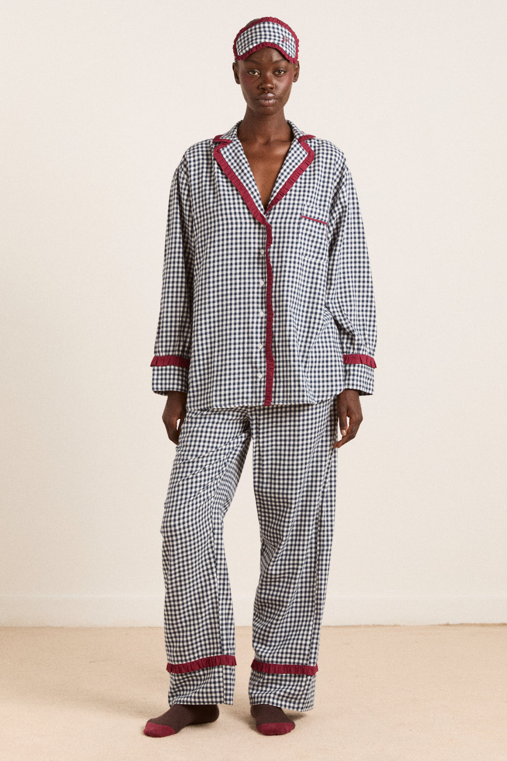 Our Antonia pyjama set in gingham returns, now in navy with burgundy trims. Made from 100% organic cotton, offering maximum cosiness.