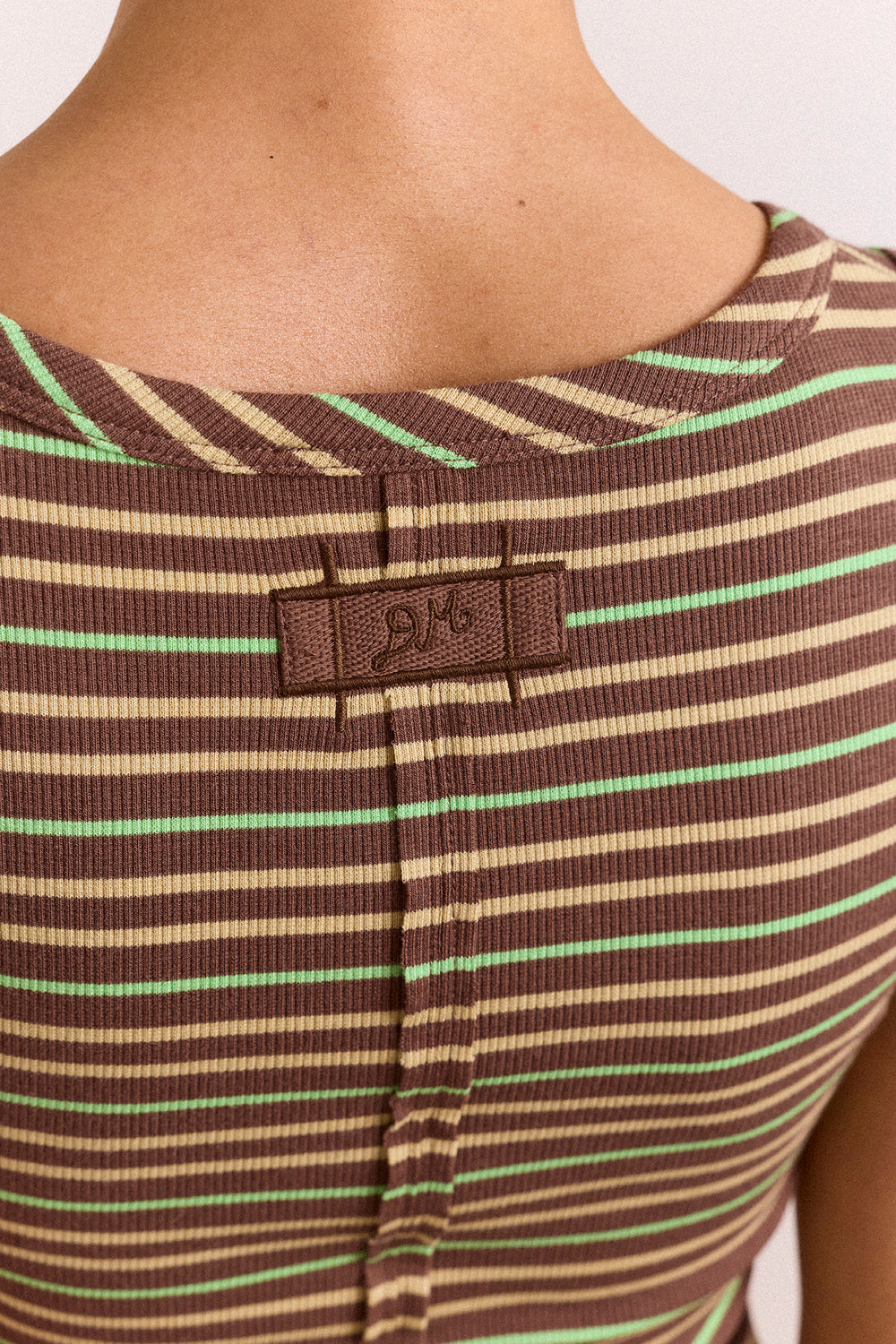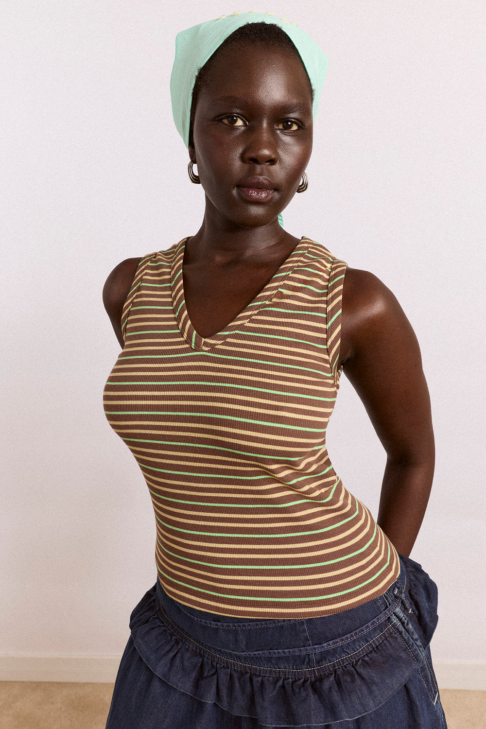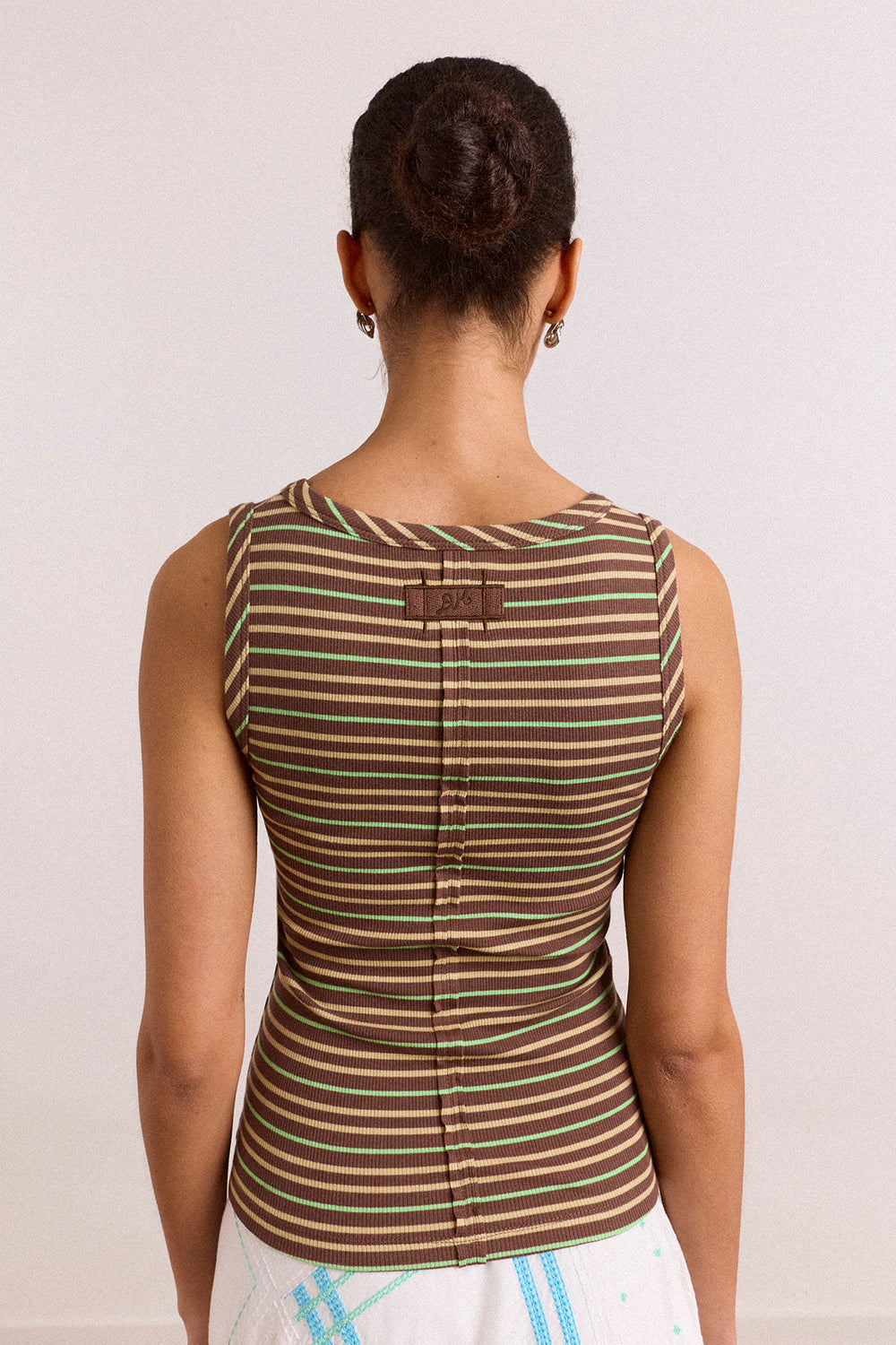 The Arlea Tank is a sleek, fitted essential. Featuring a low V-neck, raw center-back seam, and brown and green stripe fabrication, it’s finished with grosgrain branding at the back neck.
