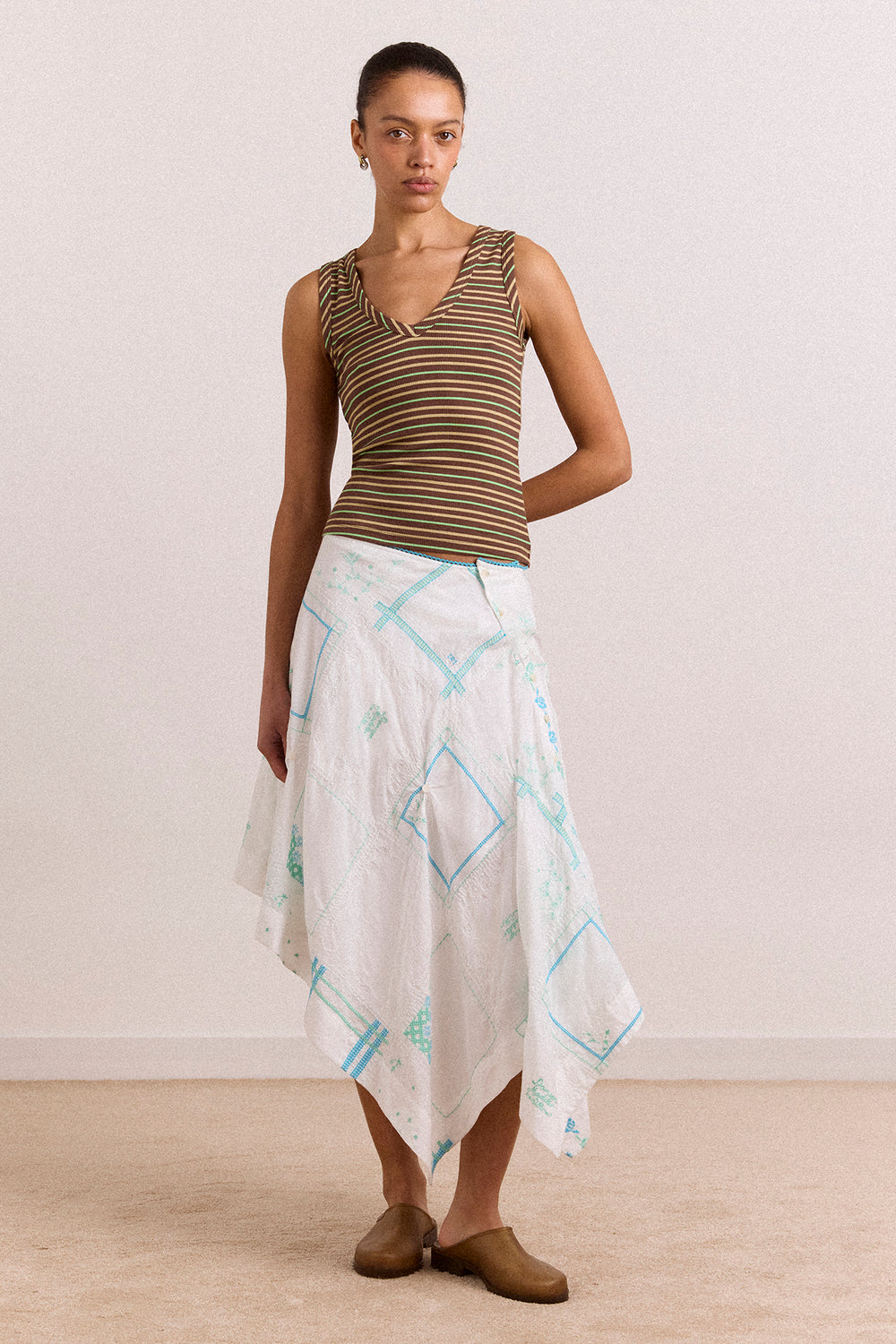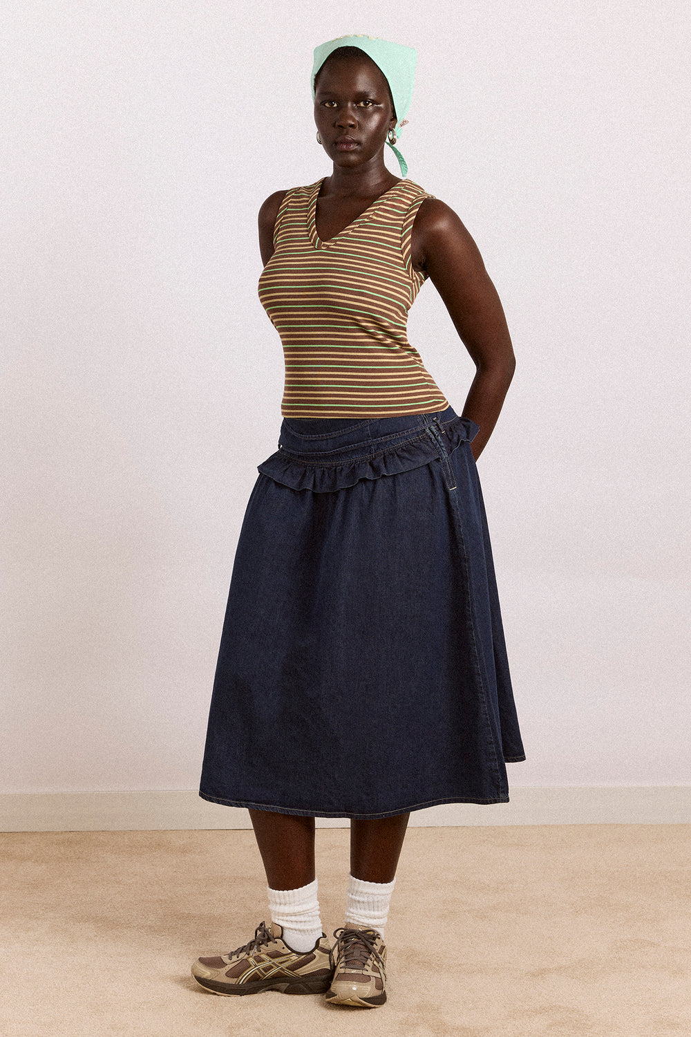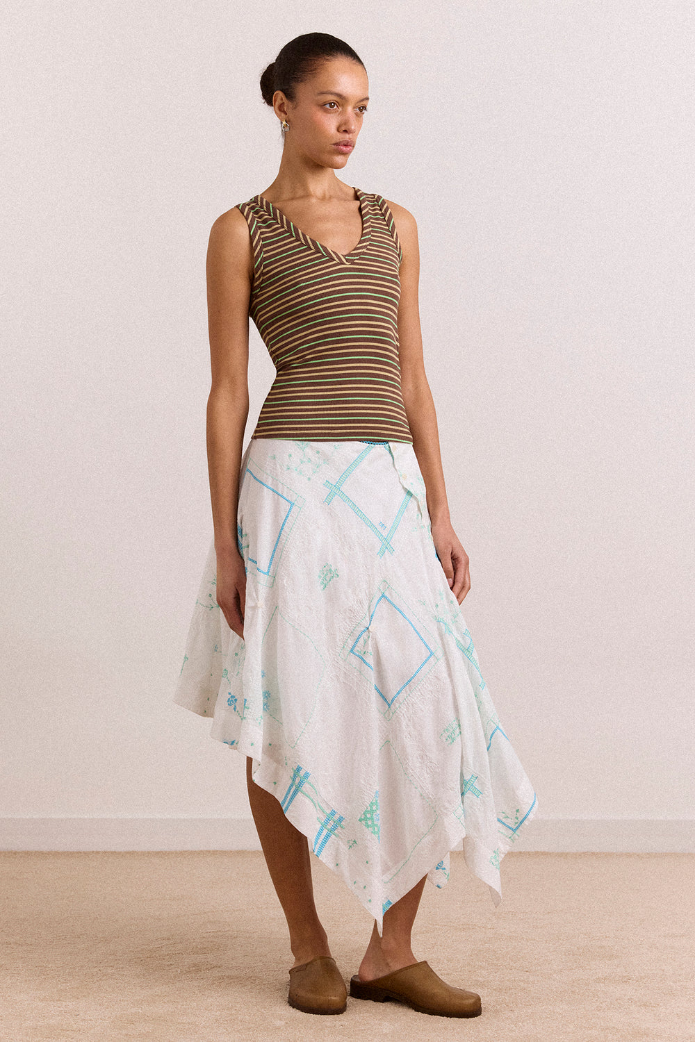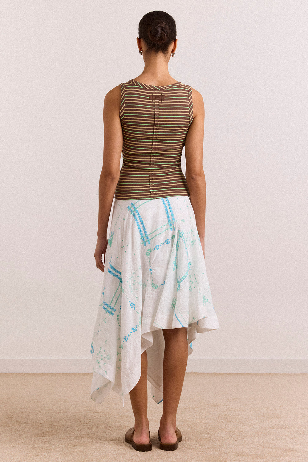 The Arlea Tank is a sleek, fitted essential. Featuring a low V-neck, raw center-back seam, and brown and green stripe fabrication, it’s finished with grosgrain branding at the back neck.