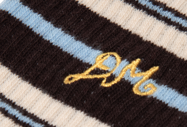 Meet our signature calf length socks in brown stripe. Crafted from 75% organic cotton, 23% recycled nylon, and 2% elastane, offering a perfect blend of comfort, durability, and a touch of stretch. The soft, organic cotton ensures a gentle feel against the skin, while the nylon and elastane contribute to enhanced flexibility and shape retention.