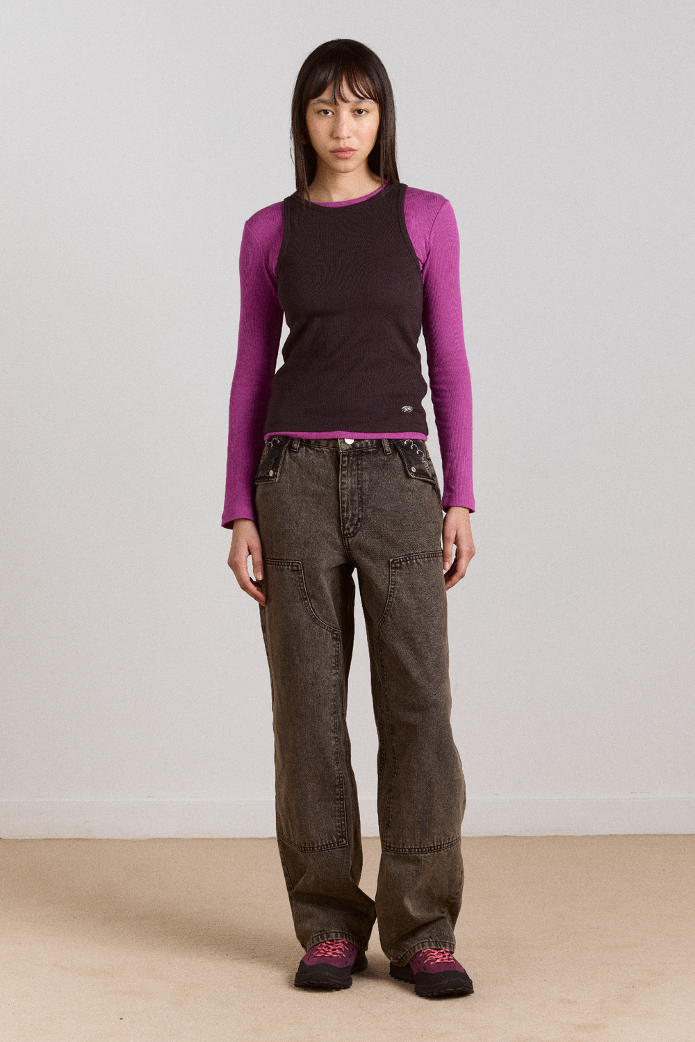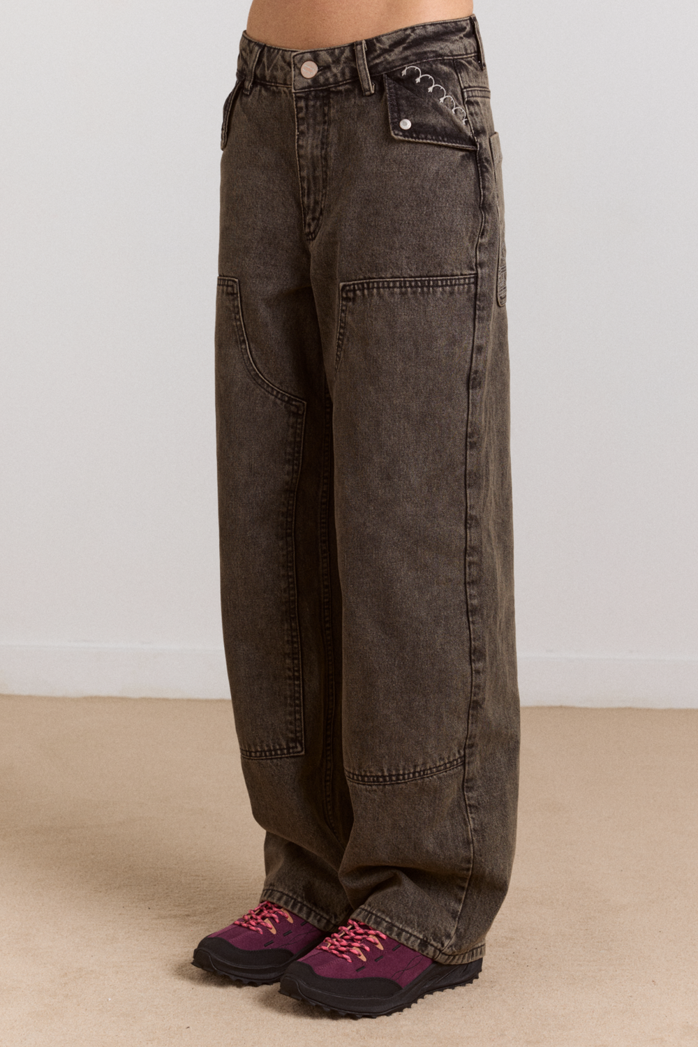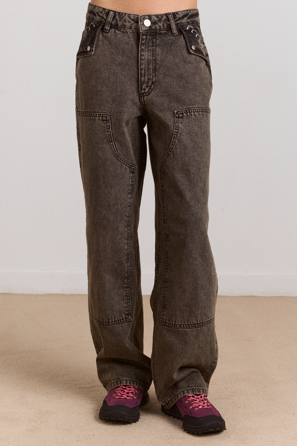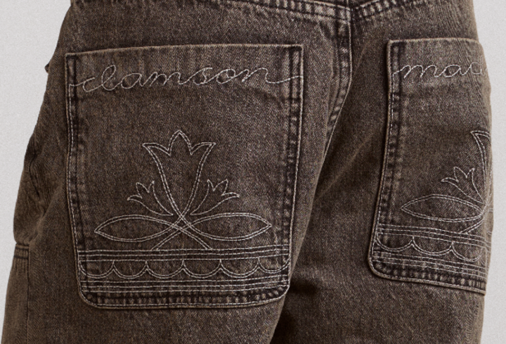 The Dempsie Jean comes in a warm ginger tint wash, crafted from a blend of organic and recycled cotton for a soft yet structured feel. Finished with embroidered pocket details and worker-style knee patches, it brings a playful twist to everyday denim.