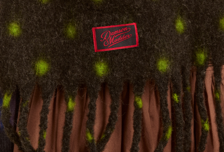Our bestselling brushed oversized scarf is back in a new spot design. Crafted in a fluffy yarn, the charcoal and lime polka dot is a winter staple. A Damson Madder woven logo patch and twisted fringe ends bring a refined finishing touch.