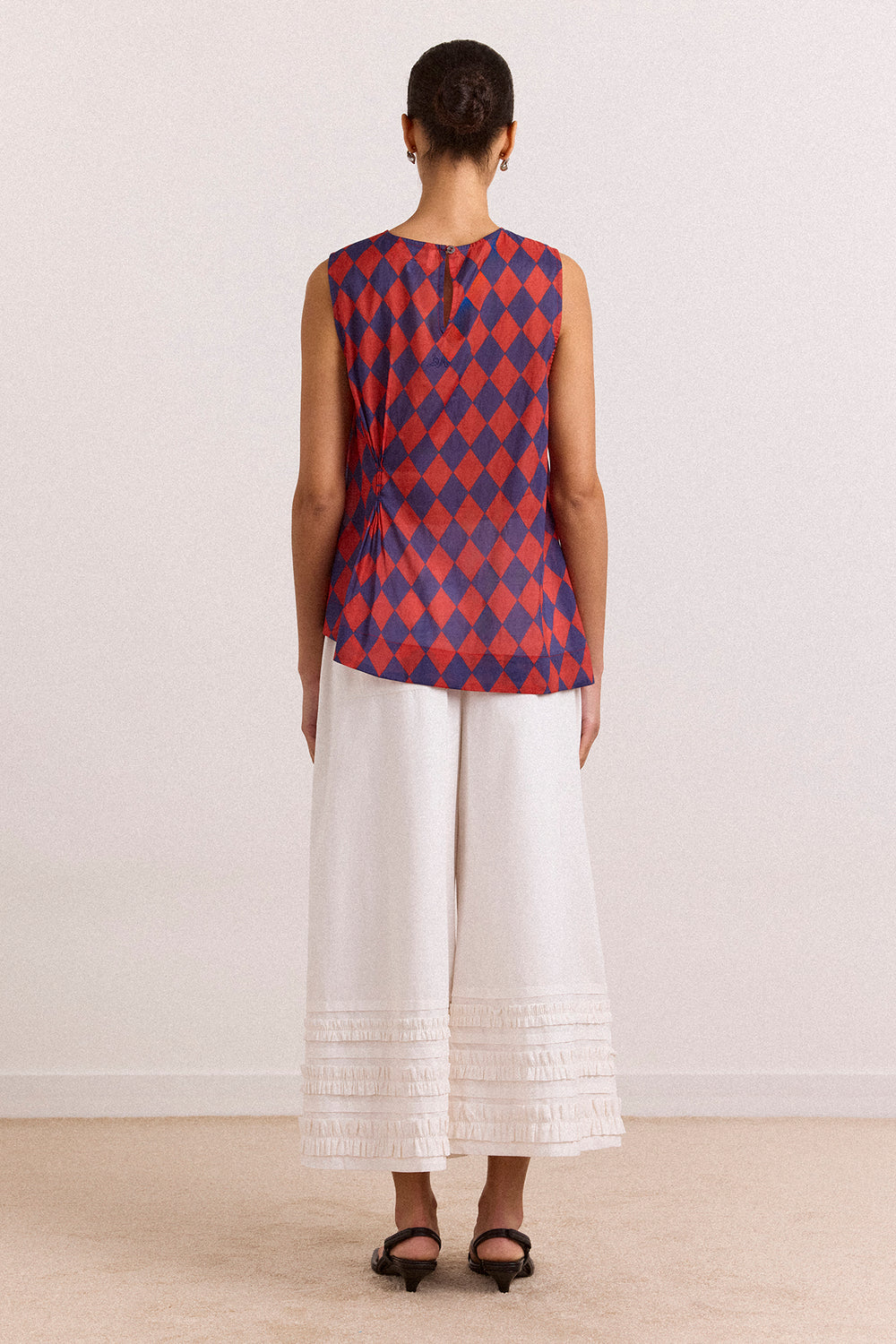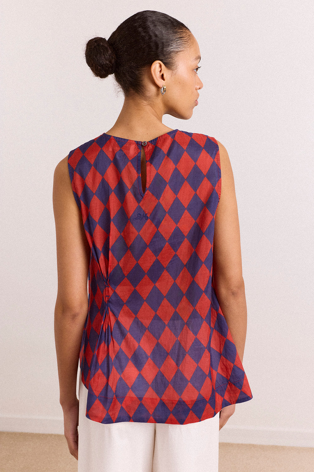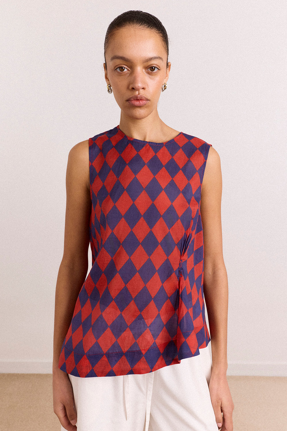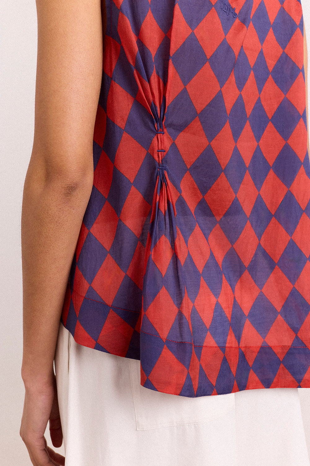 The Harmony Sheer Harlequin Blouse in red/navy is delicate and striking. Made from sheer fabric, it features a sleeveless design, button-back fastening, cinched waist with bartack detail, and an asymmetric hem.