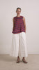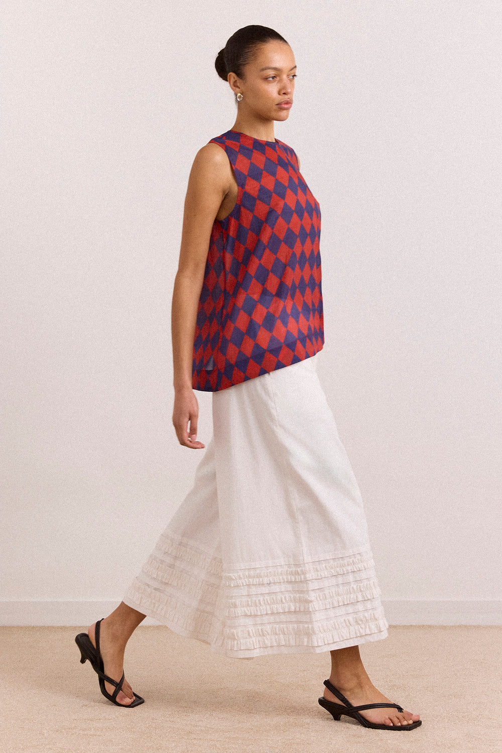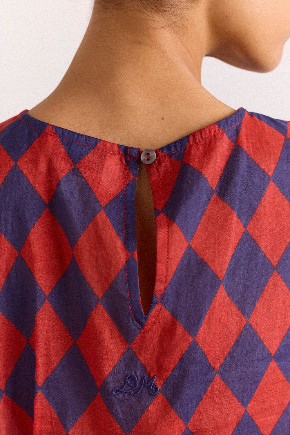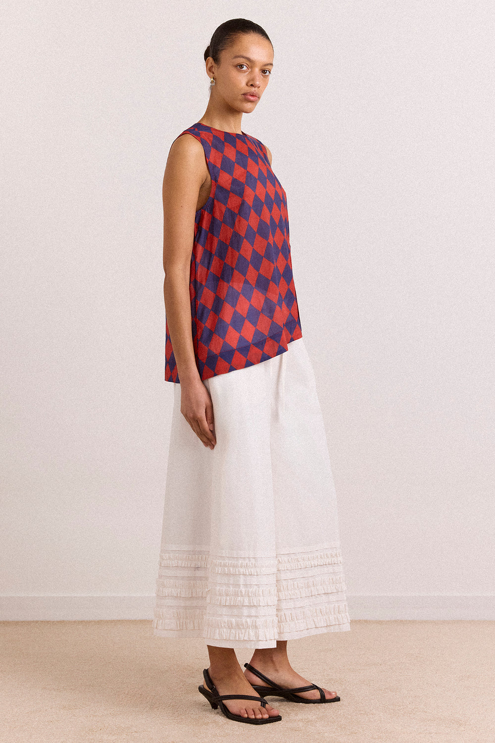 The Harmony Sheer Harlequin Blouse in red/navy is delicate and striking. Made from sheer fabric, it features a sleeveless design, button-back fastening, cinched waist with bartack detail, and an asymmetric hem.