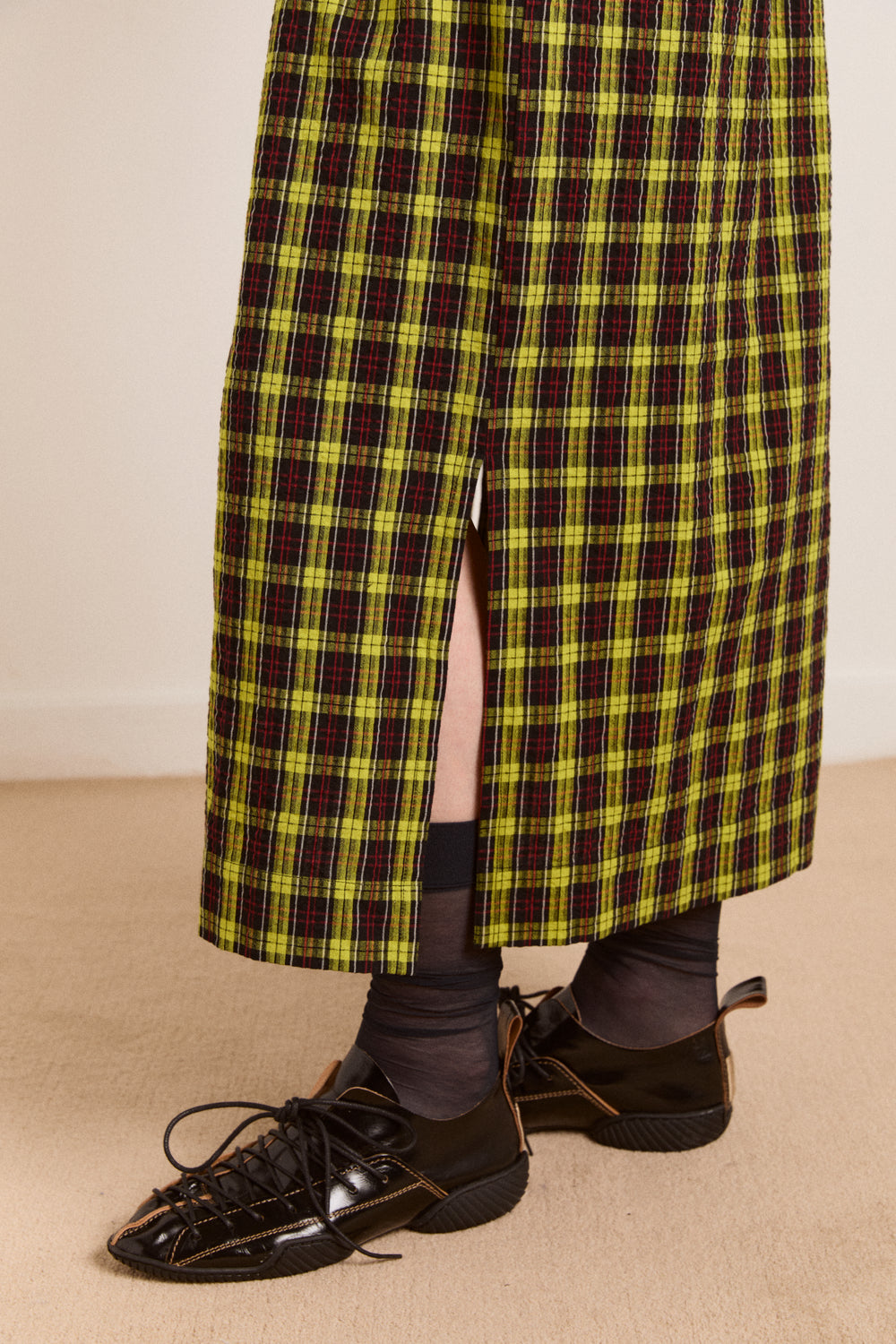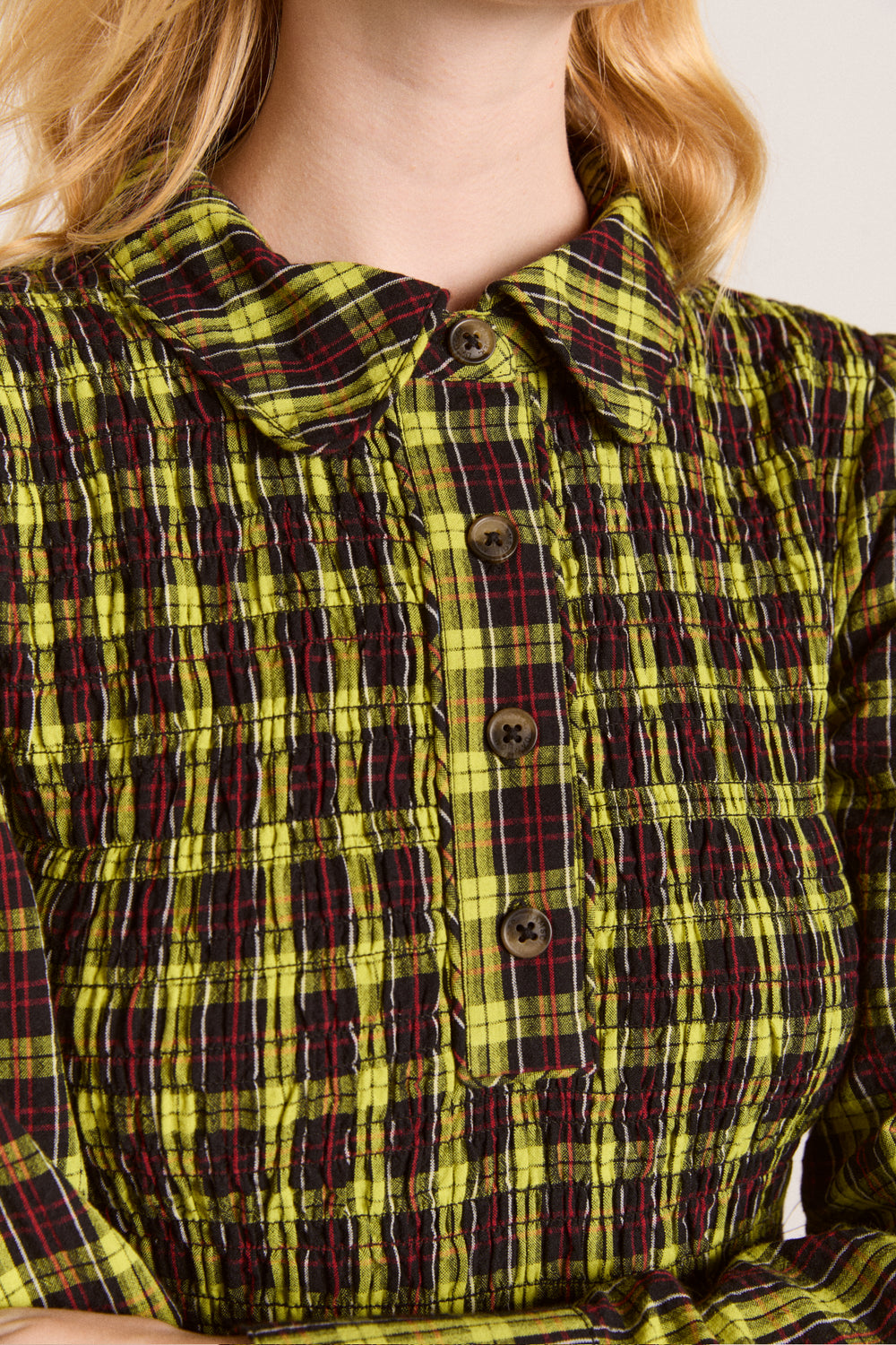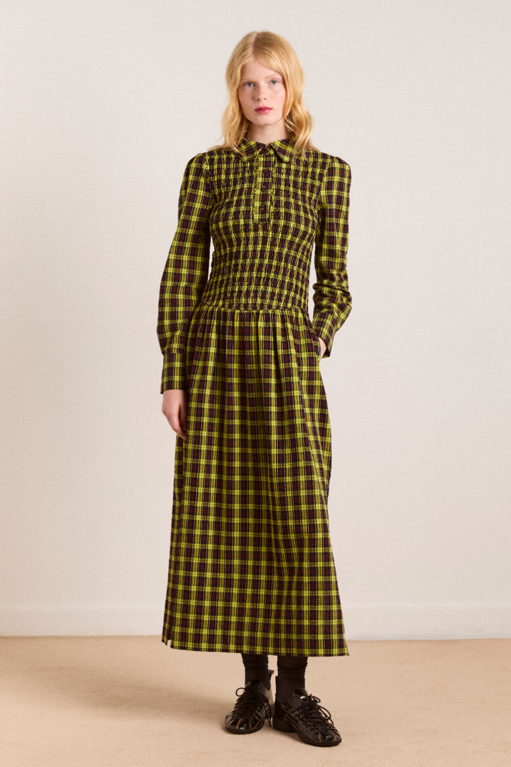 Meet the Hazel Long Sleeve Mid Dress in bold yellow check; the perfect mix of structure and softness. Made from 100% organic cotton, this dress features long sleeves with buttoned cuffs, a shirred body for a flattering slim fit, and a functional half button down placket. The best part? It has pockets! Matching accessories available.