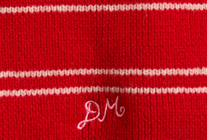 • Red and oat stripe knit design with contrast pink DM embroidery