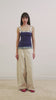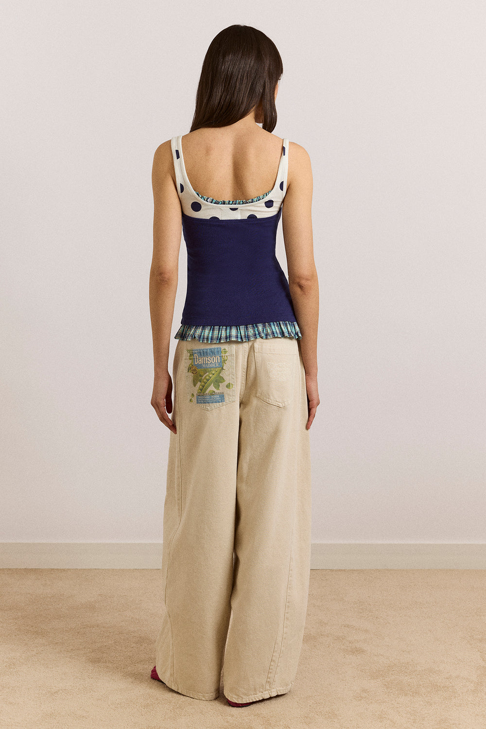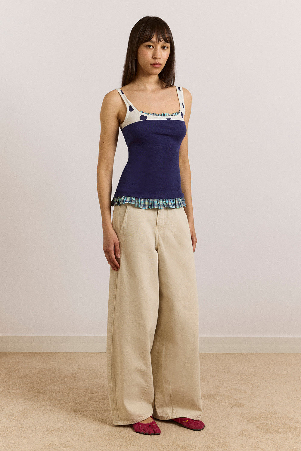 The Idelle Jersey Top in navy is a playful take on a classic tank. Designed in a fitted silhouette with a scoop neckline, it features mixed spot and navy stretch jersey with woven check frill trims for a layered effect. Finished with Damson Madder embroidery at the front hem.