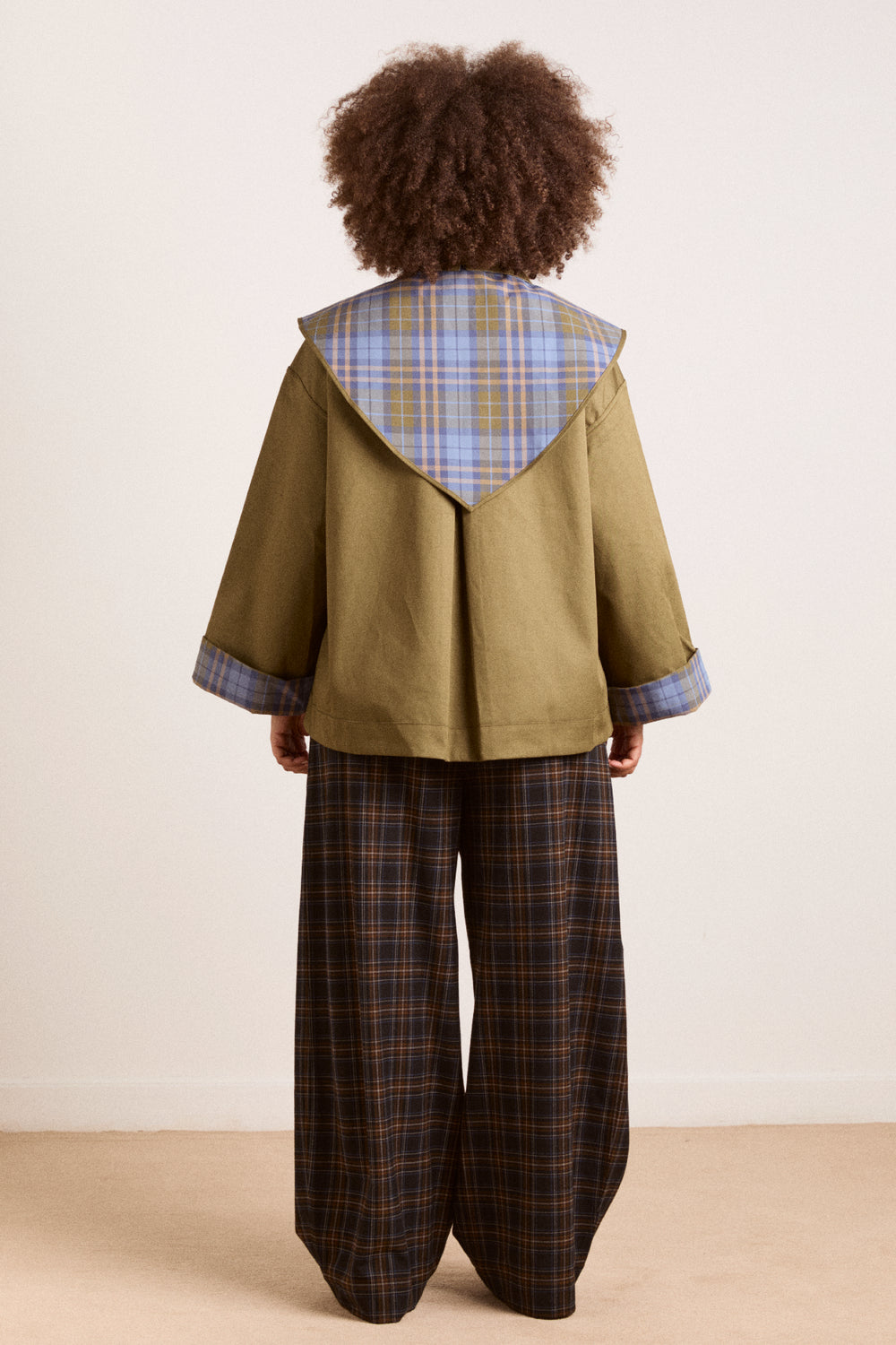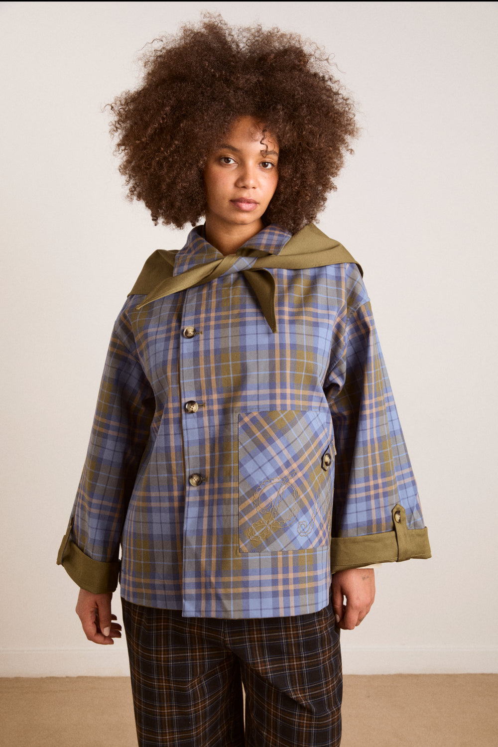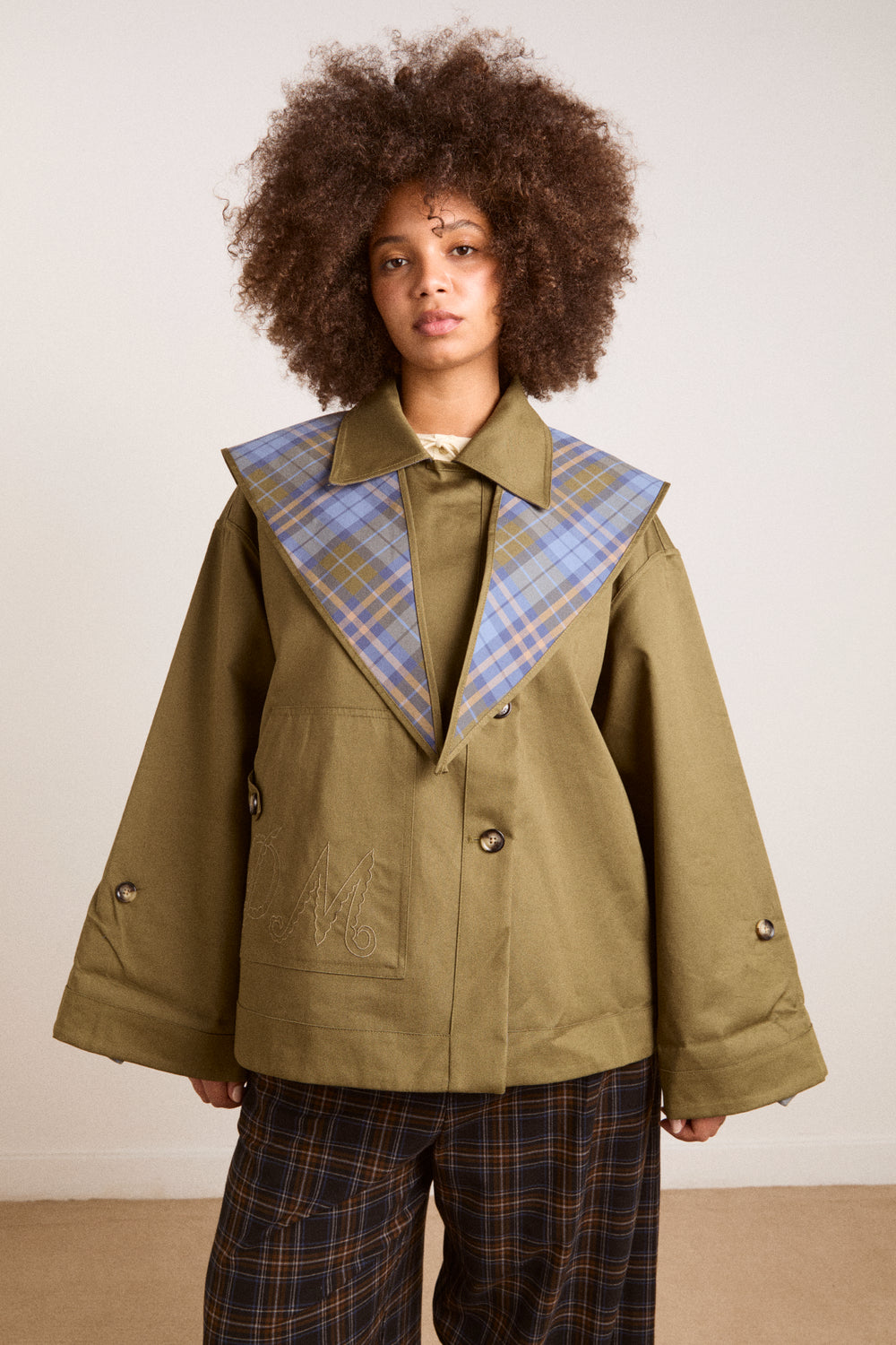 The Reversible Jerry Crop Trench is a cropped style with mock horn buttons, embroidery detail on the pocket and a detachable collar that can be worn as a headscarf. Cut from 100% organic cotton, the Jerry is fully reversible, providing you with endless styling options.
