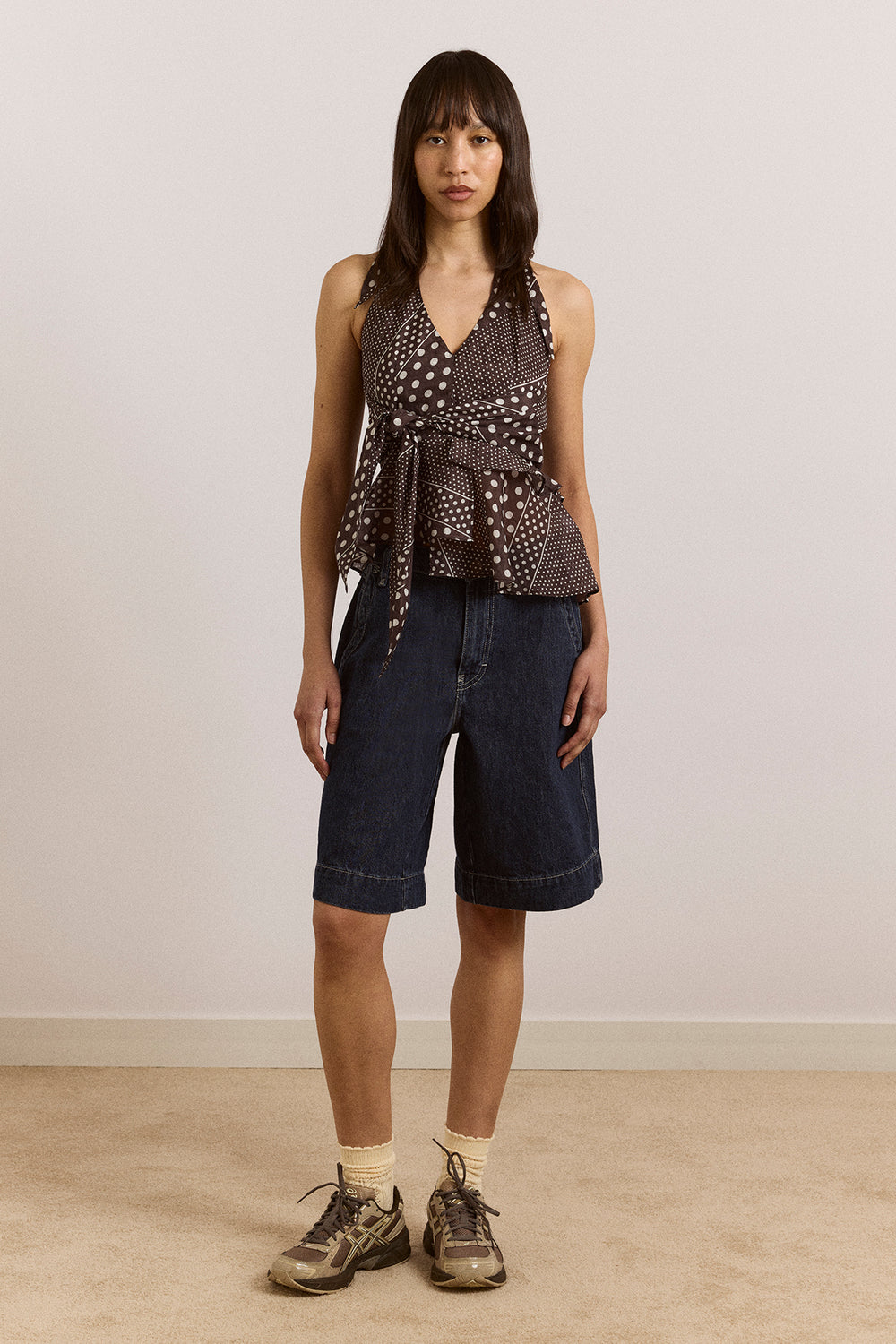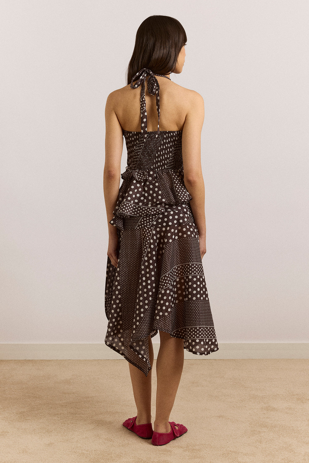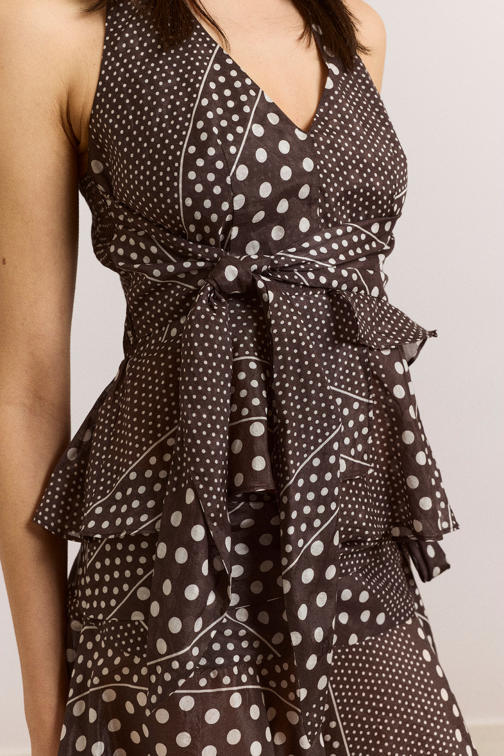 The Leandra Halter Cami in washed black spot is a lightweight statement piece. Designed with a V-neckline, functional halter tie, and a tie at the front waist, it features a smocked back panel and an asymmetric hem, all in a printed sheer lyocell fabric.