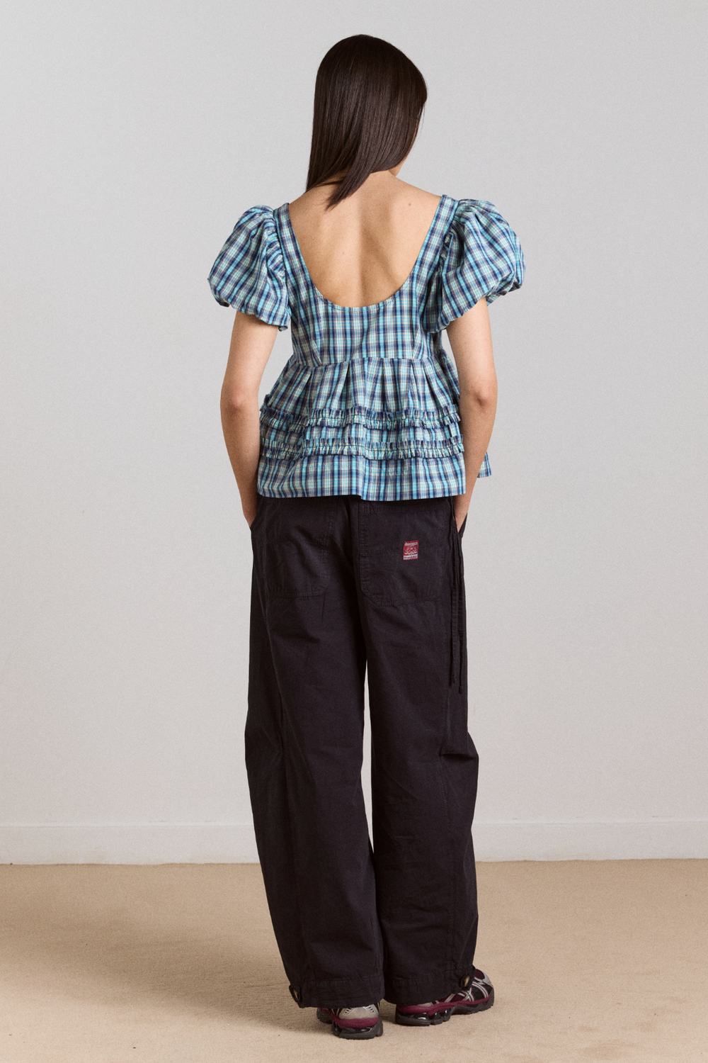 The Liv Trouser, now refreshed in new black colourway, features a full-length, baggy barrel leg with a relaxed feel and soft organic cotton fabric. Detailed with a ruched frill at the waistband, twisted seams through the leg, and a zip fly with button closure. Designed for easy, everyday wear, pick your usual size. Due to the special dye process used to create this finish, some loss of colour may occur after washing. We recommend washing inside out at 30 degrees.