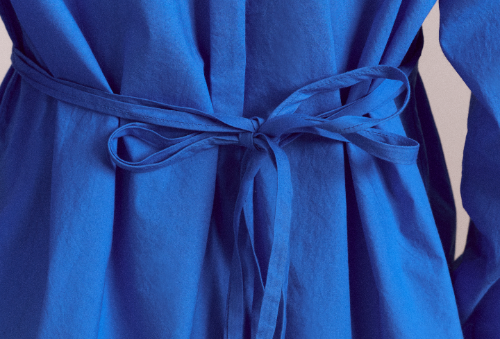 The Lux Shirt in blue is cut from crisp 100% organic cotton and is defined by its dramatic asymmetric button placket.  A statement in and of itself, ties at the back of the shirt allow you to customise the fit and accentuate your waist.