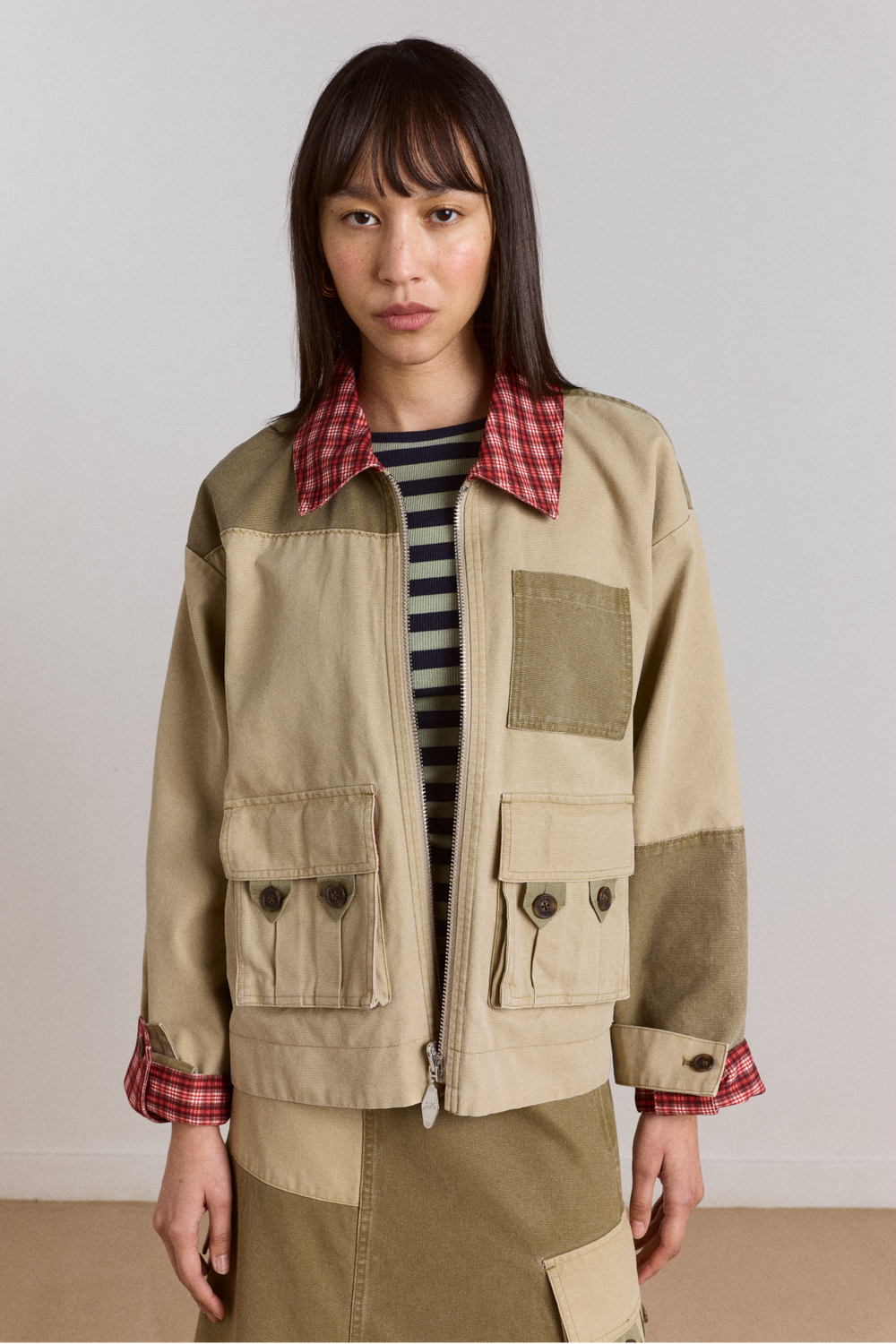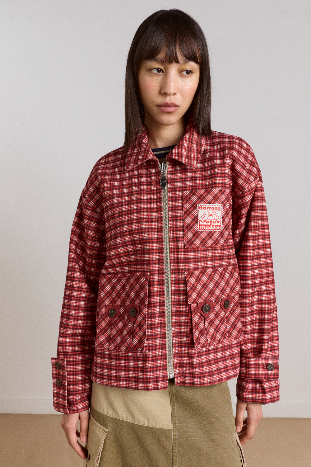 A boxy barn jacket designed with a fully reversible construction. Can be worn with the khaki colour block side or red gingham side as the outer. Finished with functional pocket detailing, branded hardware, and subtle design accents throughout. Features a branded metal zip puller that flips over for wear on either side, along with a DM branded patch on the gingham side. A colour block neckline and box pleat detail at the back complete the design.