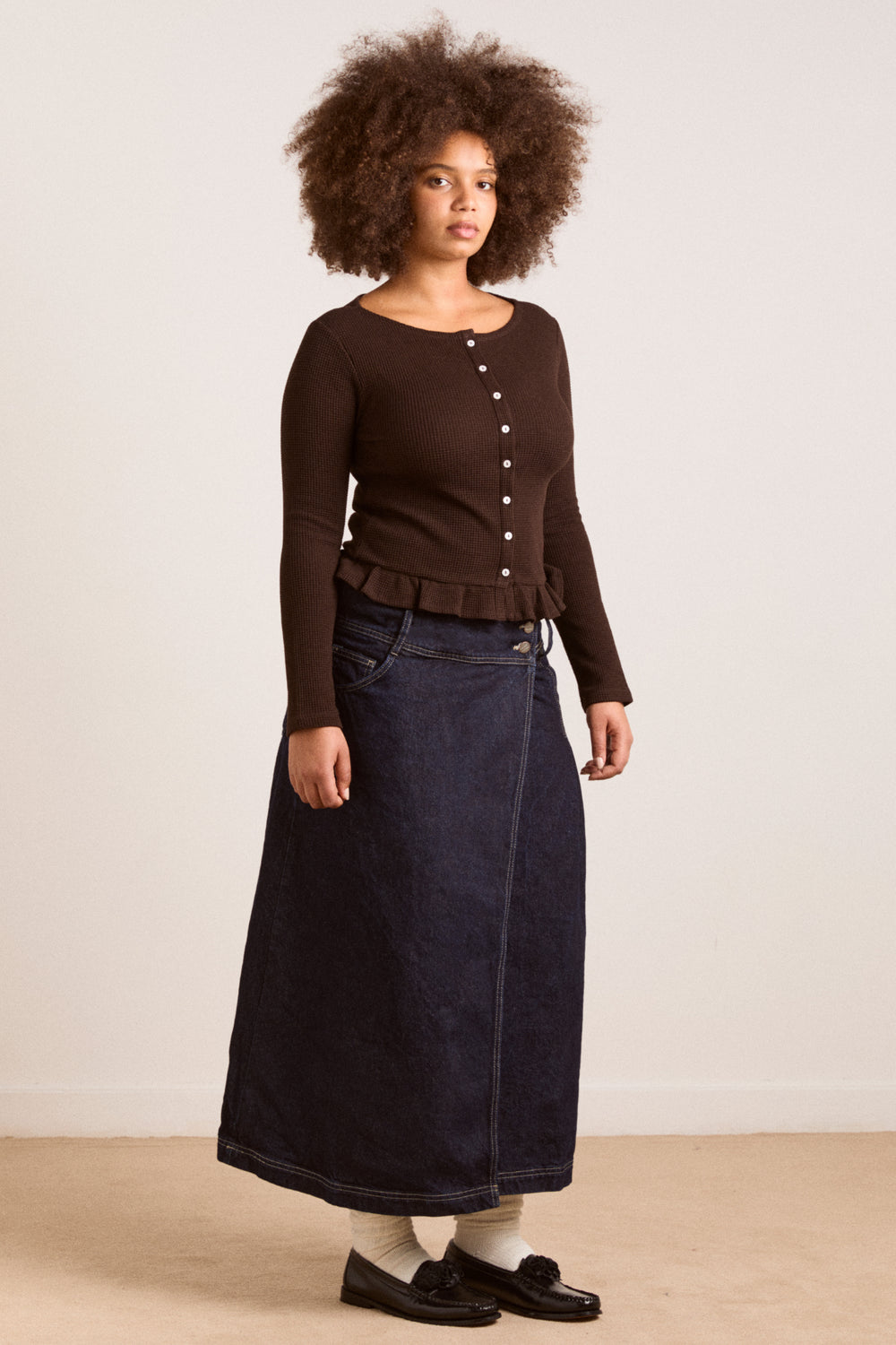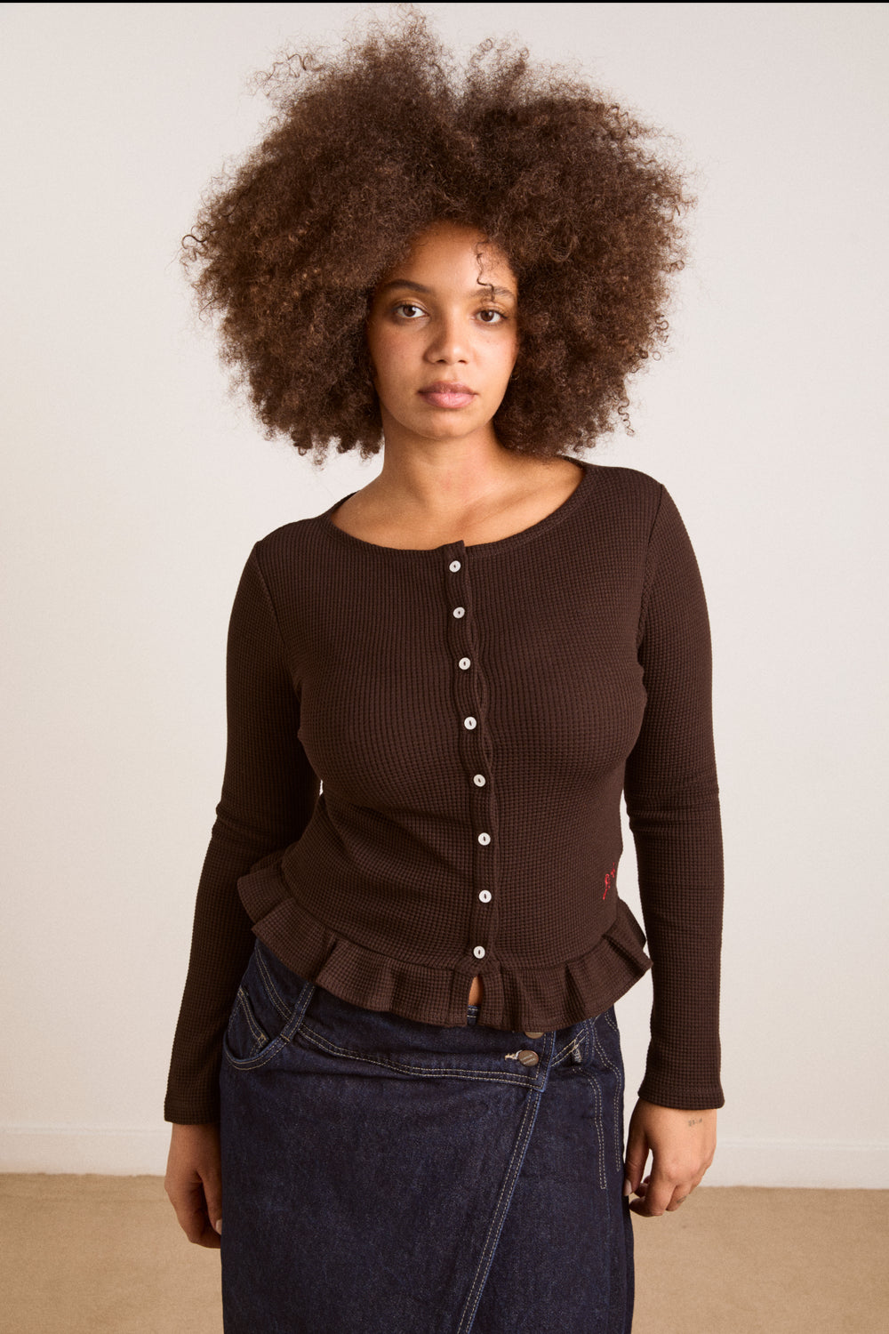 Crafted from soft, waffle fabric, this chocolate brown top is your go-to for cooler days. Designed with a flattering boat neckline and long sleeves, it’s finished with a frill hem detail that adds a feminine touch. Faux shell buttons down the front elevate the look. Made from 95% organic cotton and 5% elastane, it offers just the right amount of stretch. Thoughtfully designed in London and made in Türkiye.