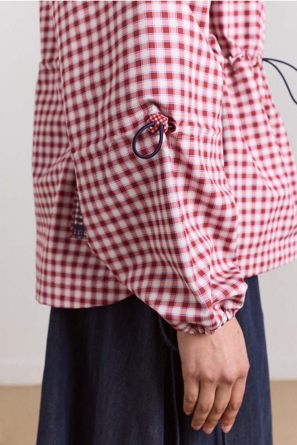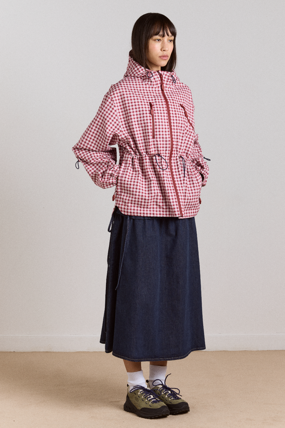 • Adjustable waist and sleeve in contrast red bungee cord detail