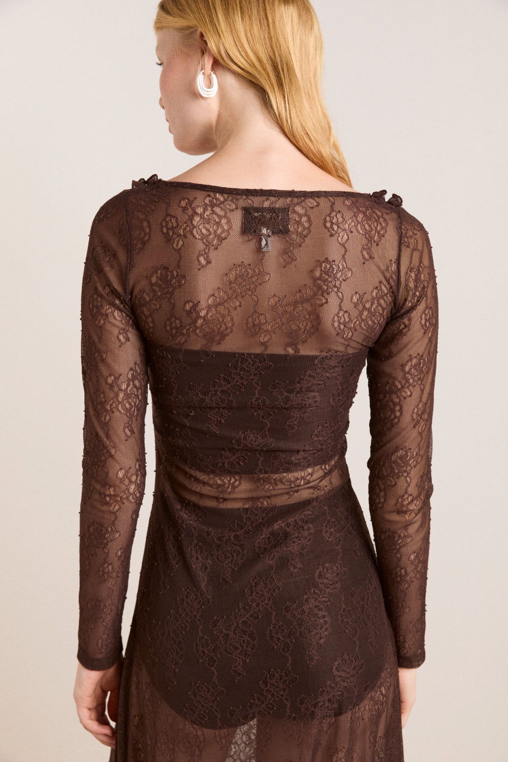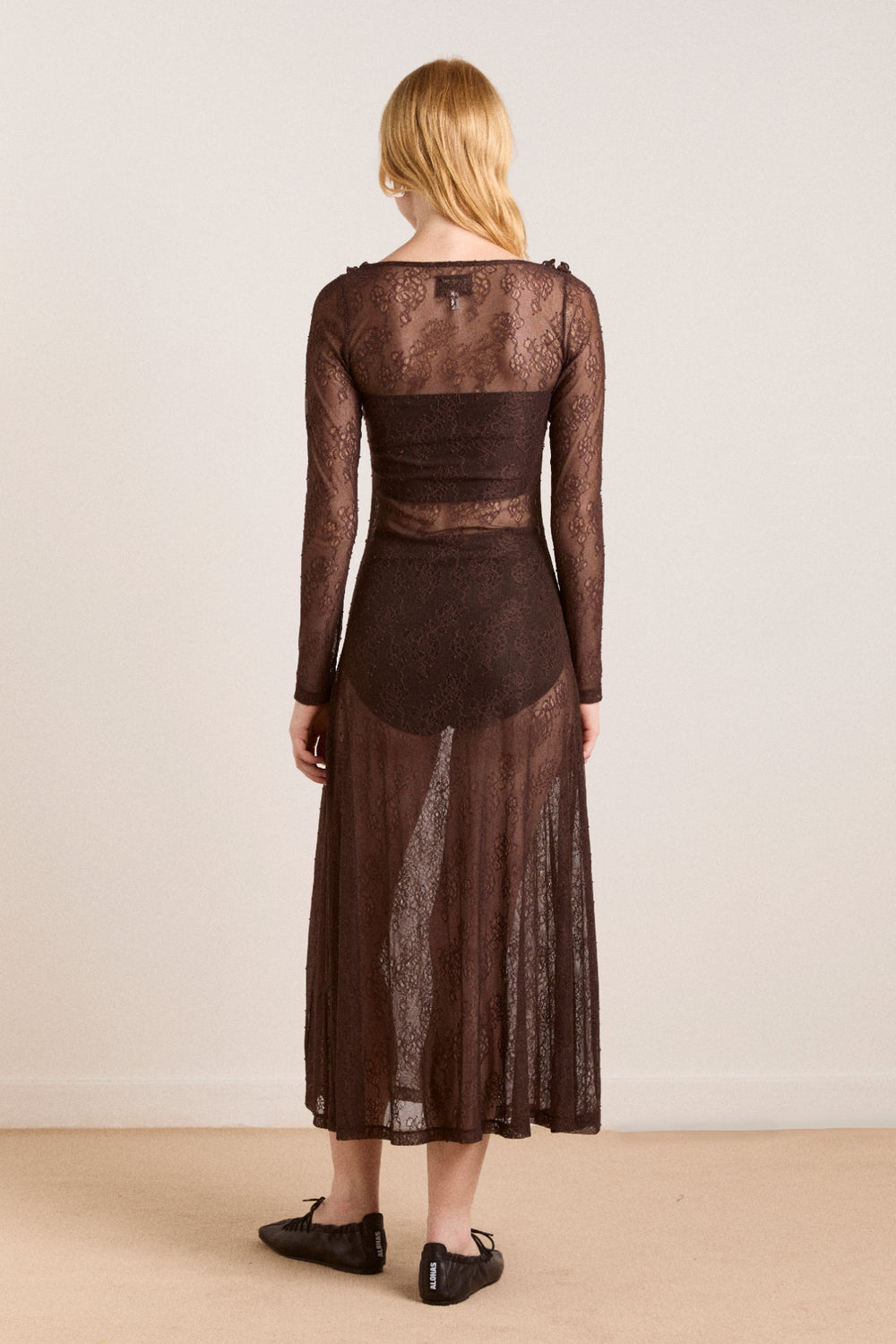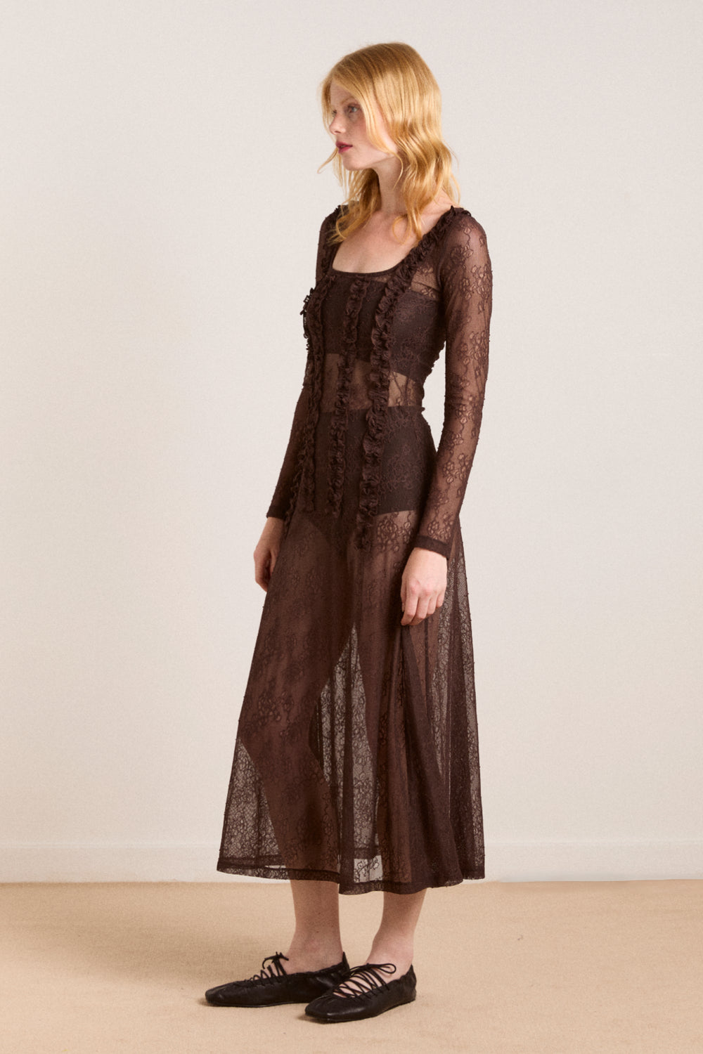 Vintage-inspired and effortlessly feminine, the Raphi Lace Midi Dress in coffee is adorned with an all over rose lace design and ruffle detailing. Crafted with stretch fabric for a flattering fit, the Raphi features a square neckline and long sleeves. Perfect on its own, or layered with your favourite trousers or an oversized tee.