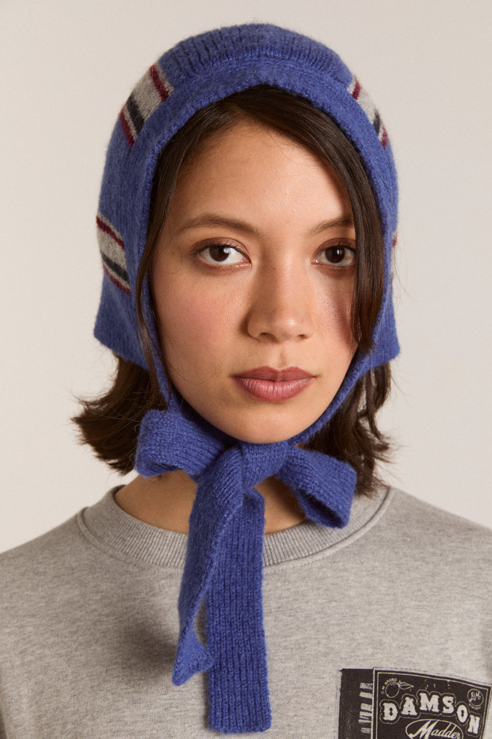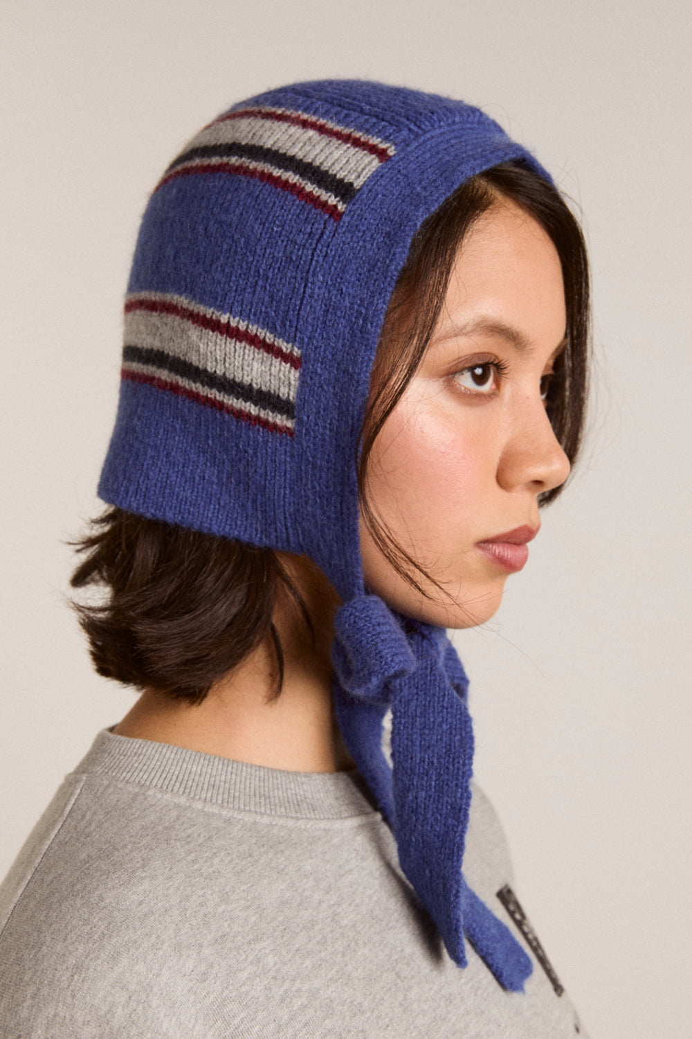 A bold twist on a winter classic. This colour-block knit bonnet features a mixed stripe design with a blue body. Finished with subtle red DM embroidery for a signature touch.
