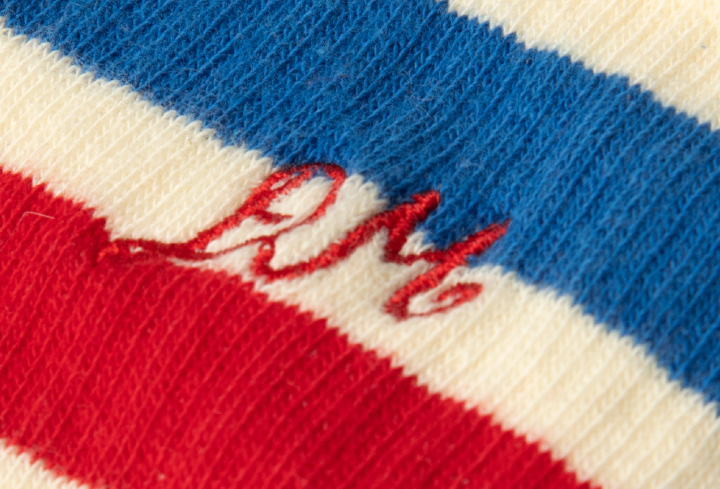 These calf-length cream socks in blue and red stripe come with signature DM embroidery and a comfy organic cotton blend, perfect on their own or styled with DM clothing.