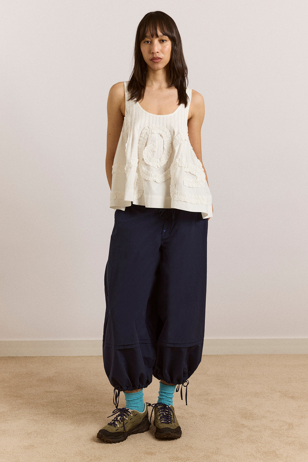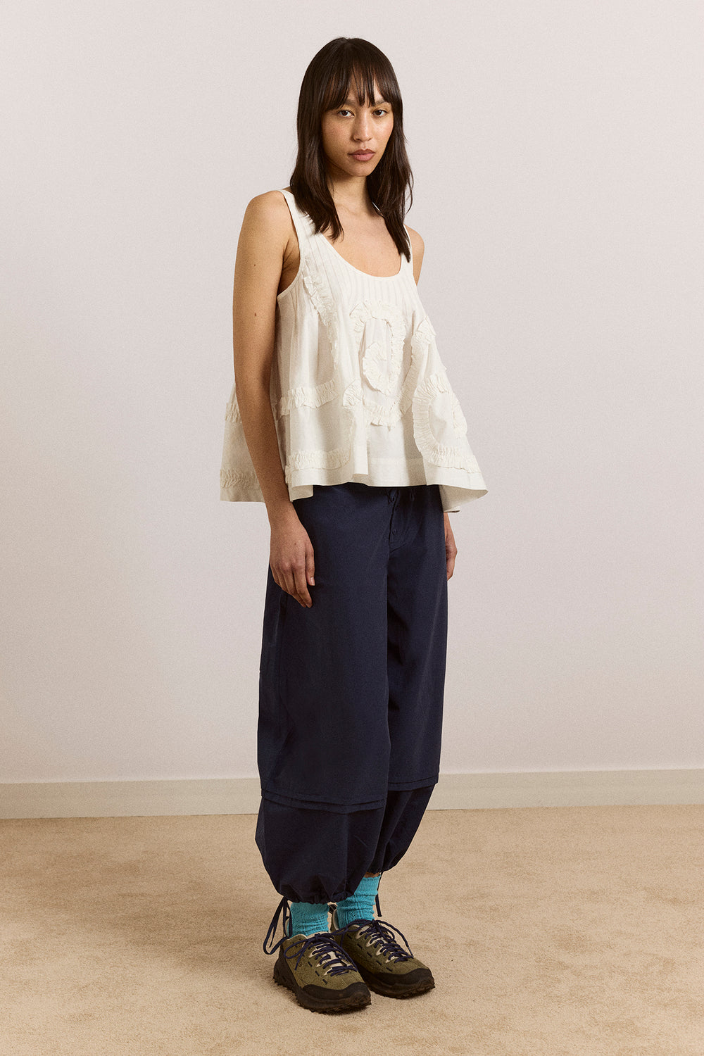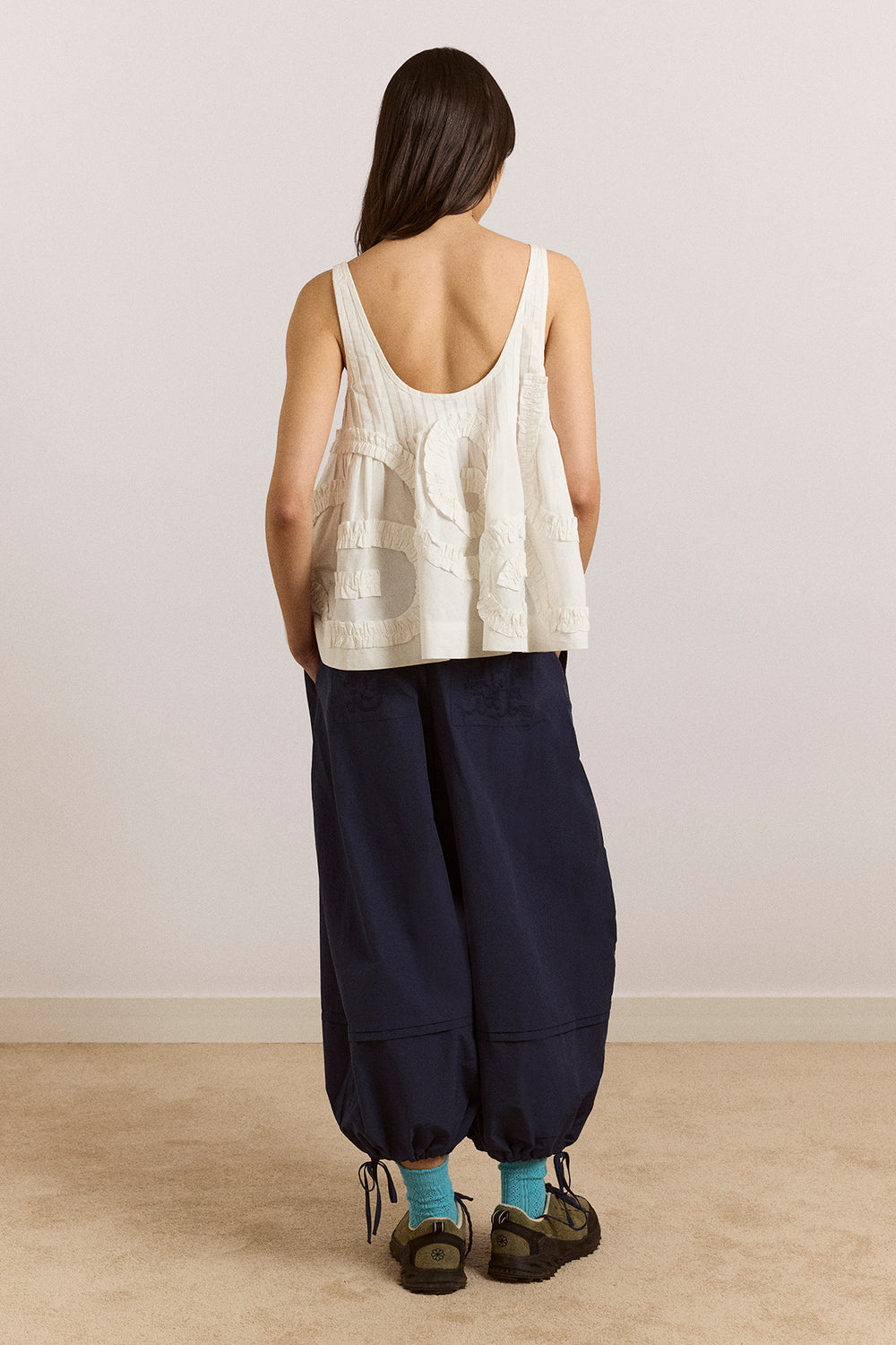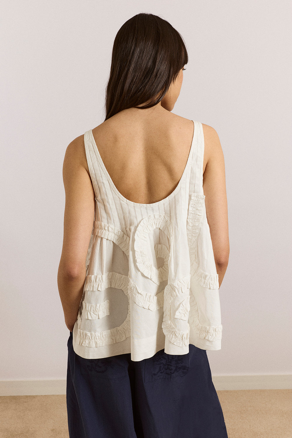 The Stella Ruffle Cami in white is a playful, easy-to-wear piece. Crafted from crisp cotton poplin, it features an all-over swirl design, pintuck detailing at the scoop neckline, and a relaxed swing silhouette. Cut oversized, size down for a closer fit.