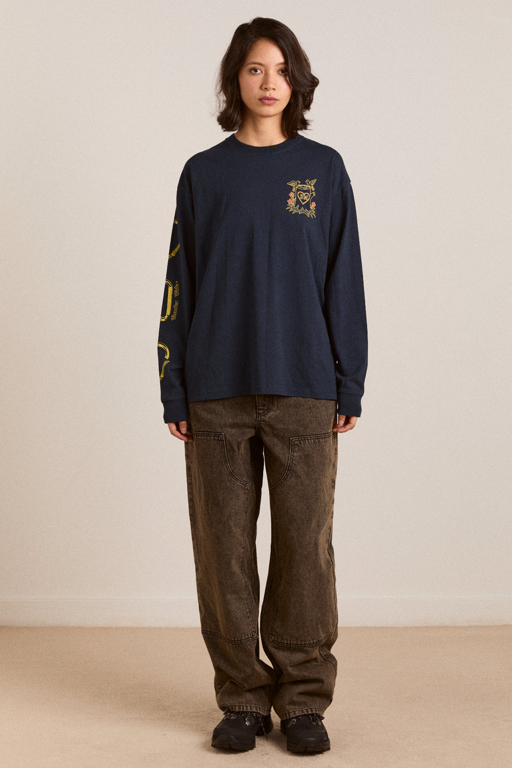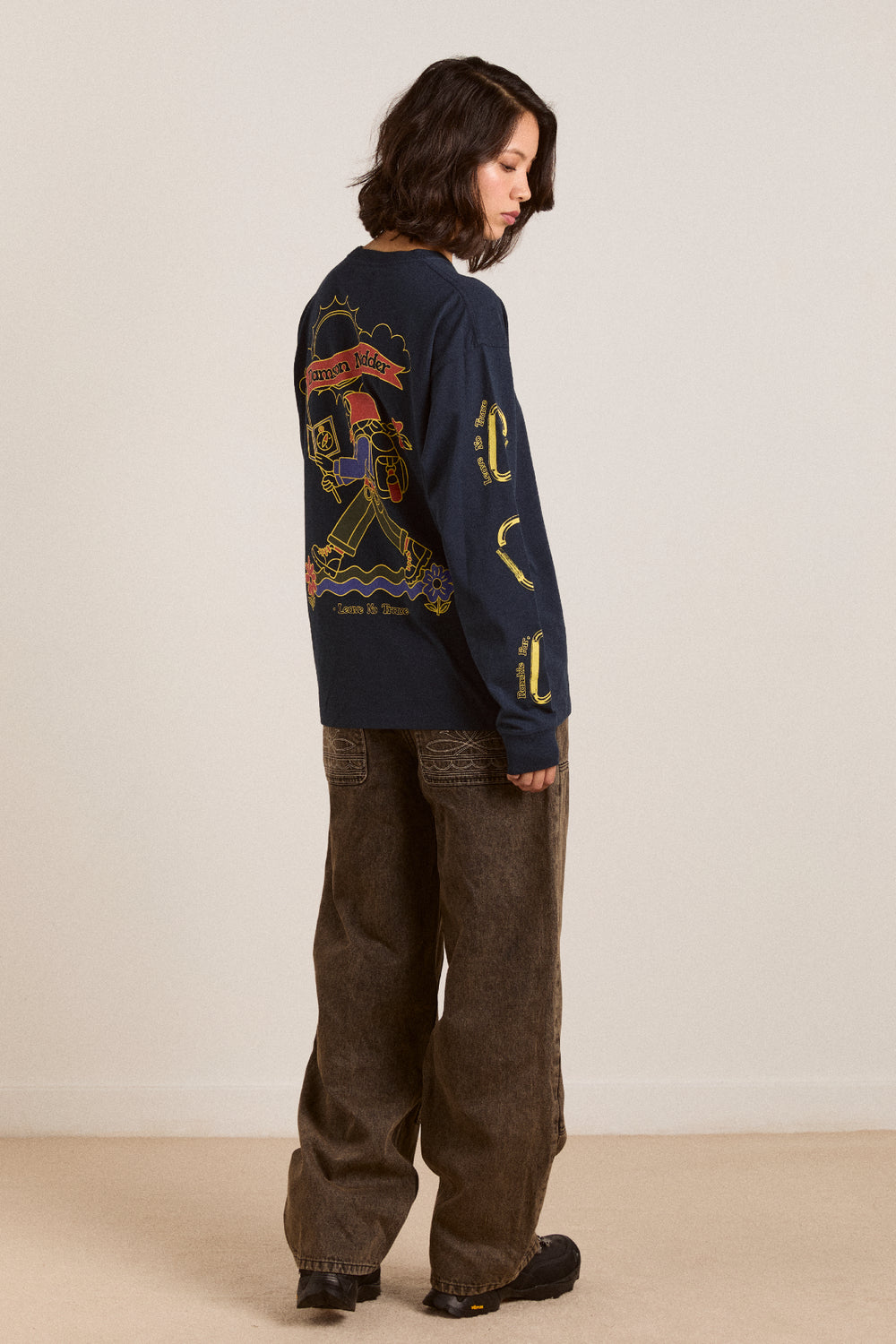 Crafted from 100% organic cotton, our Rambler Navy Long Sleeve Tee is the go-to piece you'll reach for every day. Designed with a relaxed, oversized fit, this top features thoughtfully placed graphic prints on the front and back for a playful touch.
