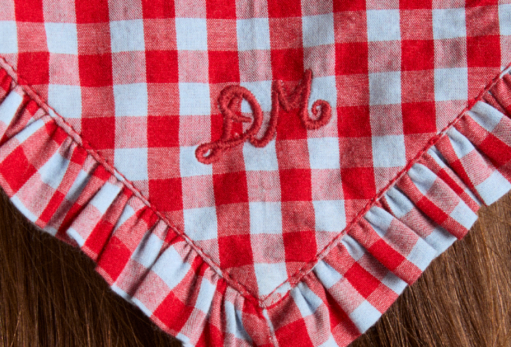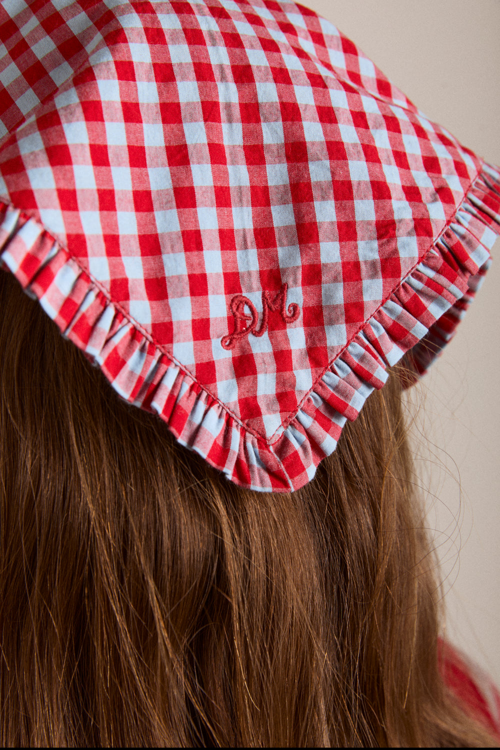 OA versatile sheer headscarf in red and blue gingham, featuring Damson Madder’s signature embroidery. Wear it multiple ways; around the neck, as a headscarf, or as a belt for a subtle, stylish accent. Pair with matching DM clothing.