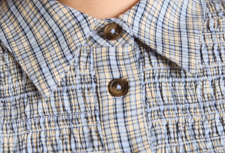 Mixing structure and softness, the Bora Mini Dress in cloudy check is the perfect transeasonal dress. Made from 100% organic cotton, this dress features long sleeves with buttoned cuffs, a shirred body for a flattering slim fit, and a functional button down placket. Matching accessories available.