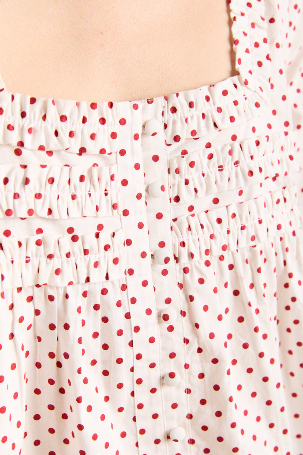 Elevate your look with the Leilani Blouse in off white and red spot. Crafted from 100% organic cotton, this blouse features a square neckline, detailed with ruffles, for a vintage-inspired, feminine feel. Complete with an A-line silhouette and flowy 3/4 sleeves, this blouse is effortless and perfect for any occasion. Pair with our matching Layla Skirt for a head to toe look.