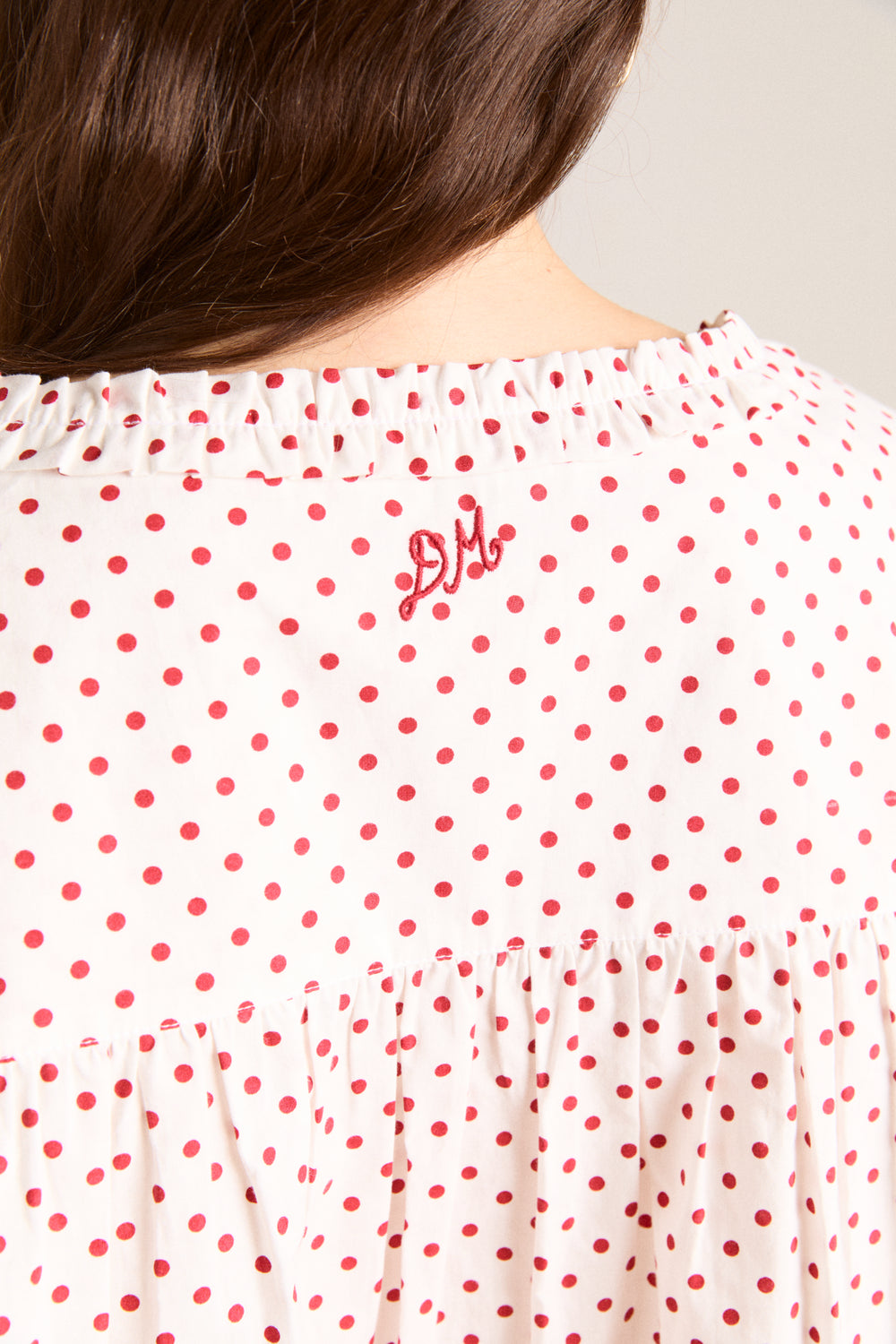 Elevate your look with the Leilani Blouse in off white and red spot. Crafted from 100% organic cotton, this blouse features a...