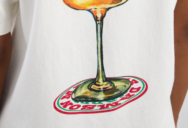 The Spritz Boyfriend Tee in white, made from 100% organic cotton, is cut to a boyfriend fit for a relaxed look. Complete with unique DM spritz graphics custom drawn by our creative director.