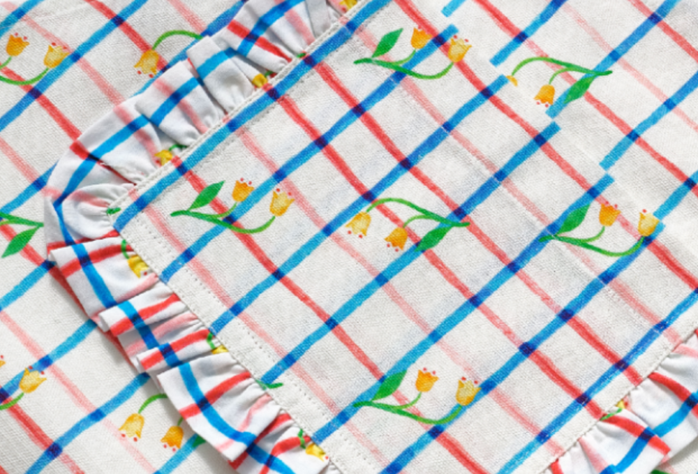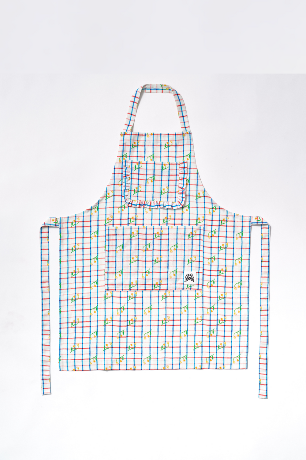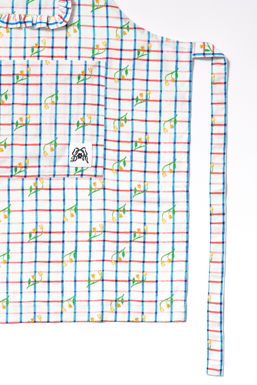 This adjustable strap apron with ruffle detailing, designed in London with a hand-painted print, combines practicality with a playful touch. Featuring a tulip check floral design and front DM embroidery, it adds personality to your kitchen. The 69 x 85 cm size is perfect for everyday use, while the two front pockets provide handy storage for all your kitchen essentials.