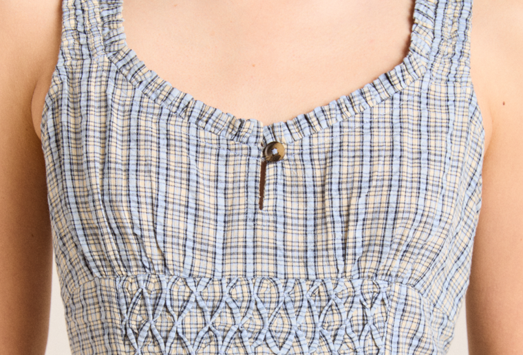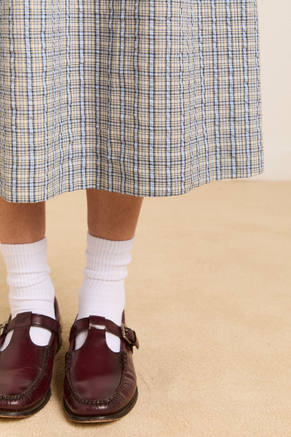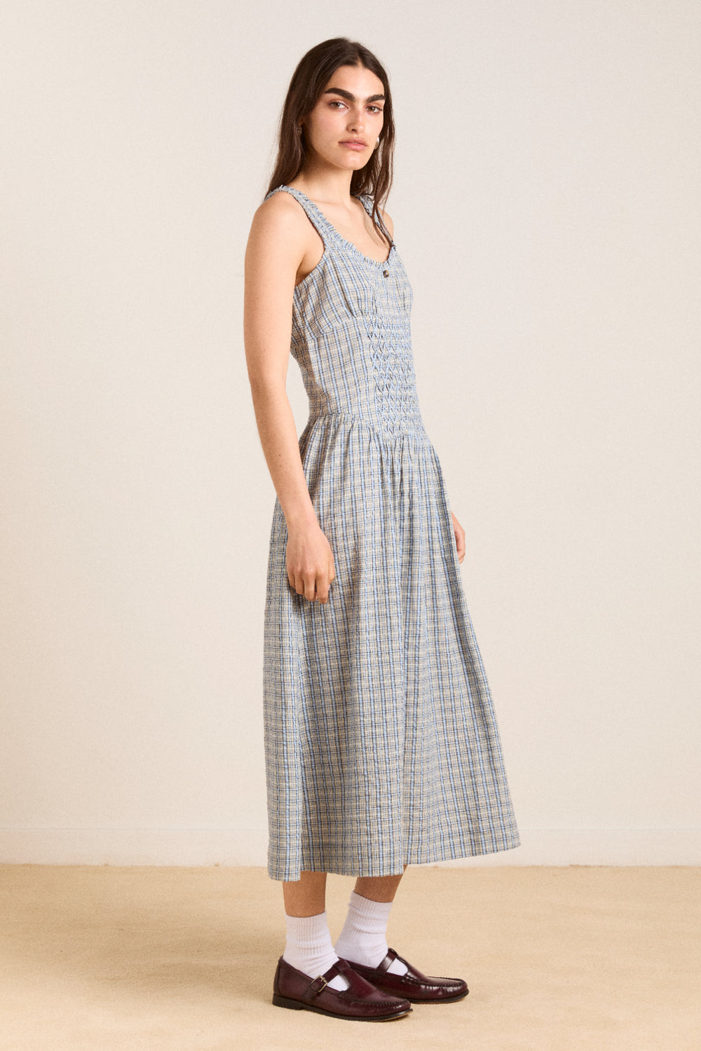 Meet the Mallory Midi Dress in cloudy check. Crafted from 100% organic cotton, it features a hand sewn smocked bodice, low back and a flowy drop waist skirt. The perfect balance of structure and softness, this dress will be on repeat season after season. Matching accessories available.