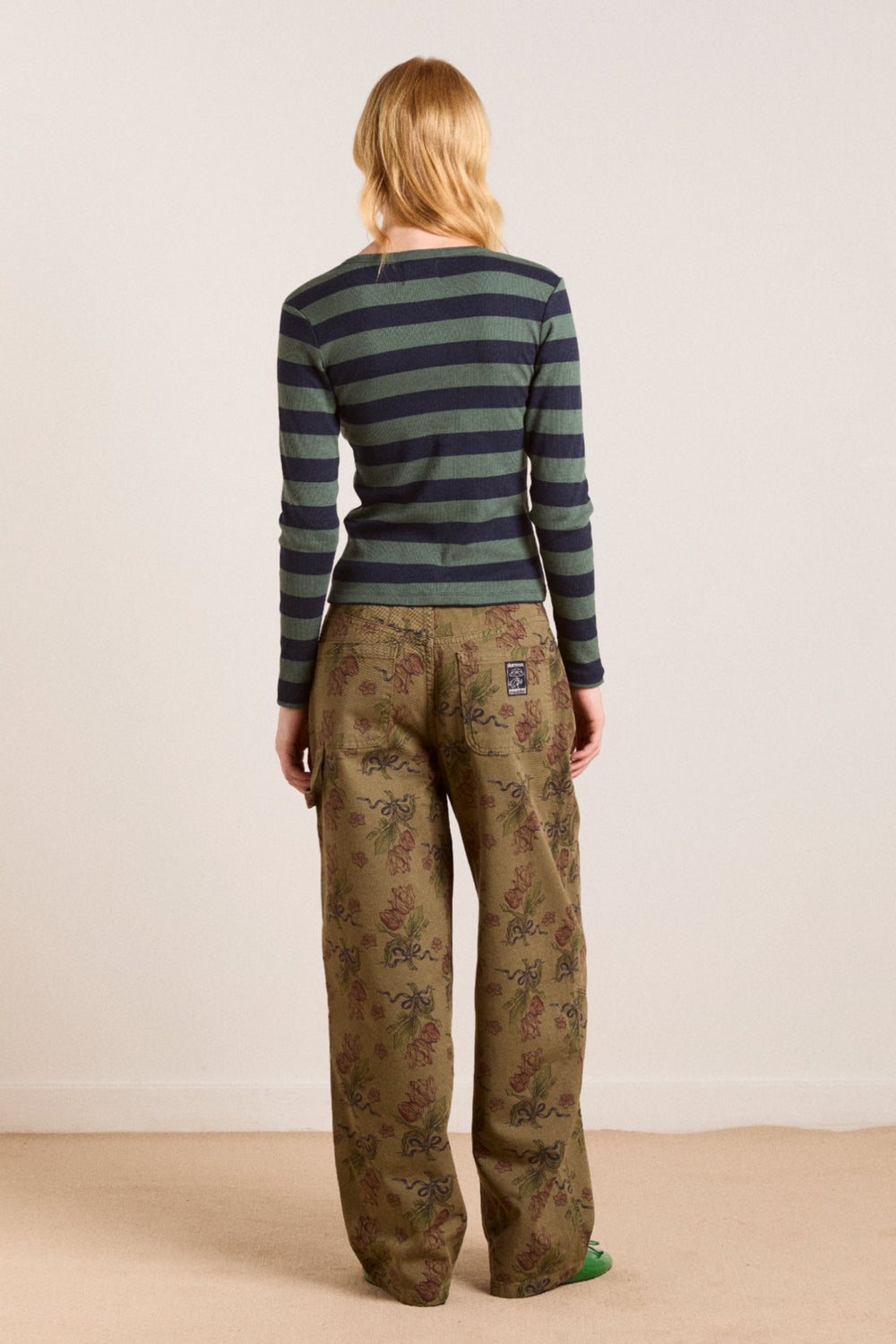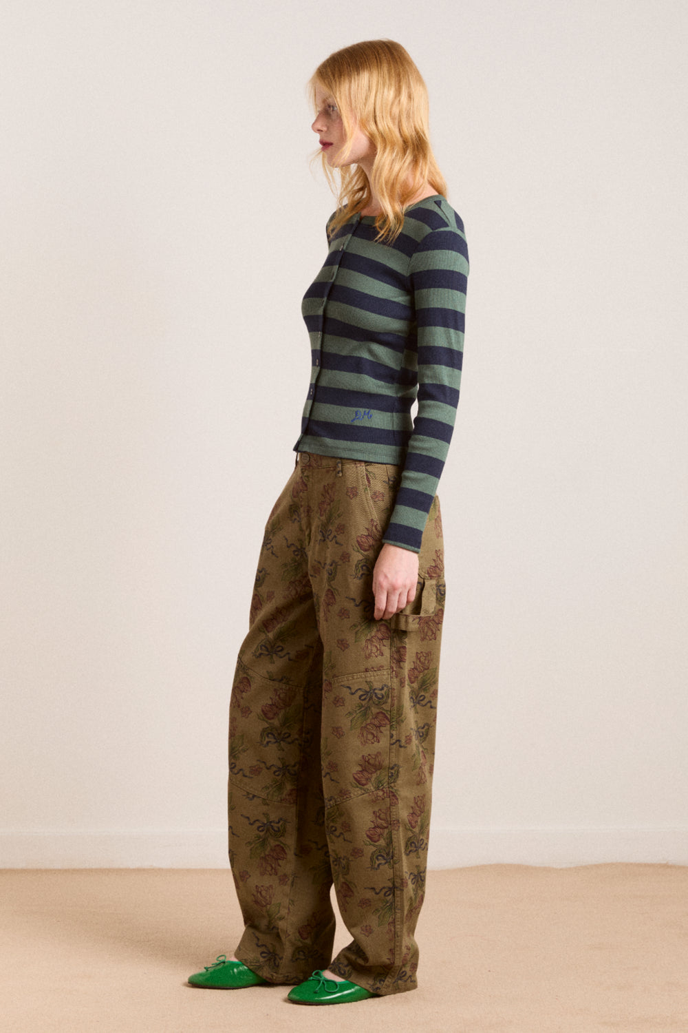 Our well-loved Drew Jeans are back in a new tulip print denim with khaki overdye, expertly crafted from 100% organic cotton. A mid rise, relaxed fit which can be adjusted to your preference with the back waist adjuster. Finished with knee panel detailing and Damson Madder branded tab on the pocket. Pair with our matching Stacia Jacket for a complete head-to-toe look.