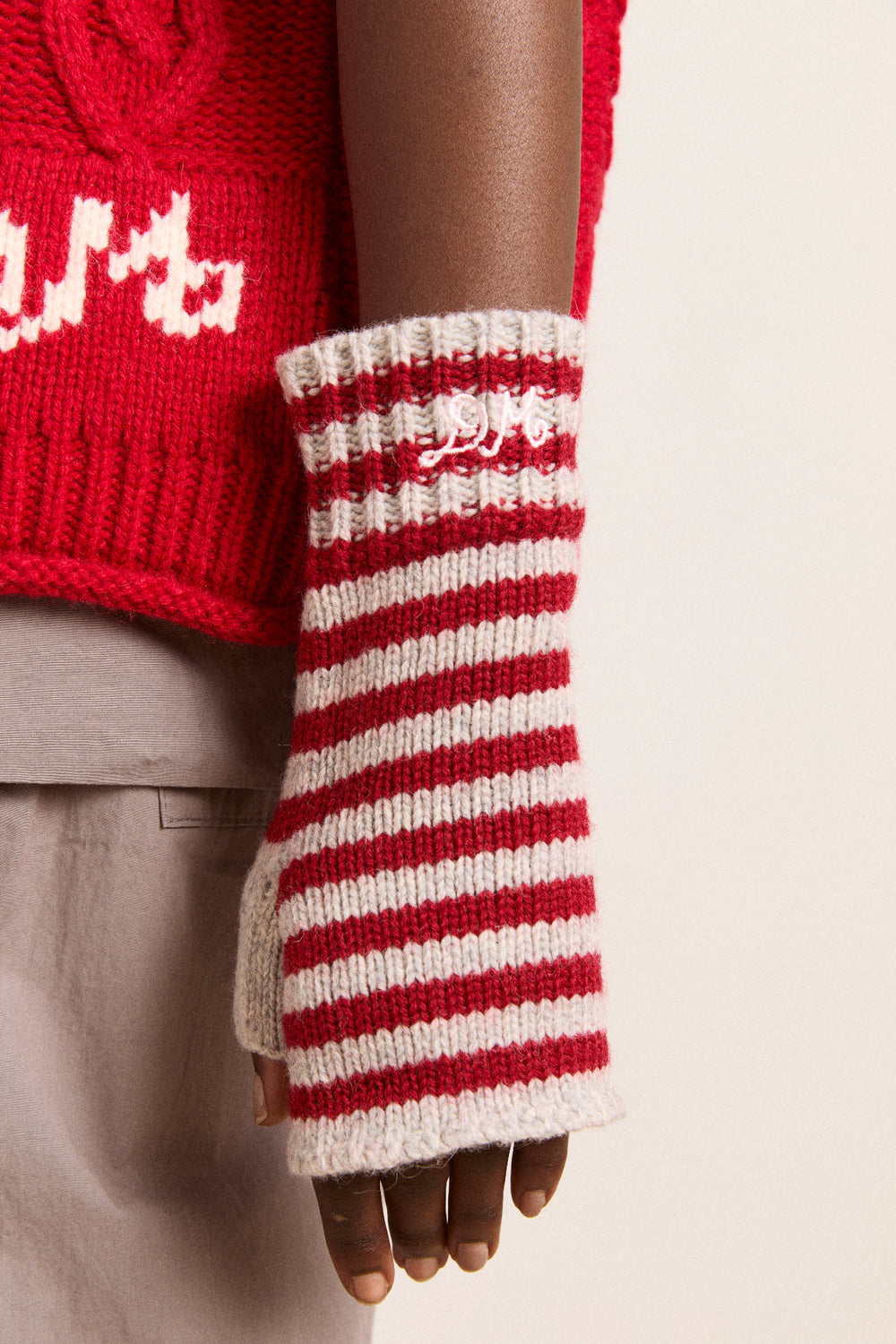 These fingerless mittens are knitted from 100% responsible wool, offering breathable warmth with a lightweight feel. Designed in London, the red and grey stripe pattern is accented by a contrast pink DM embroidery. Finished with ribbed cuffs and rolled edges, they strike the right balance between comfort and edge.