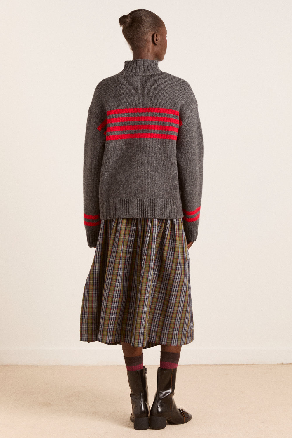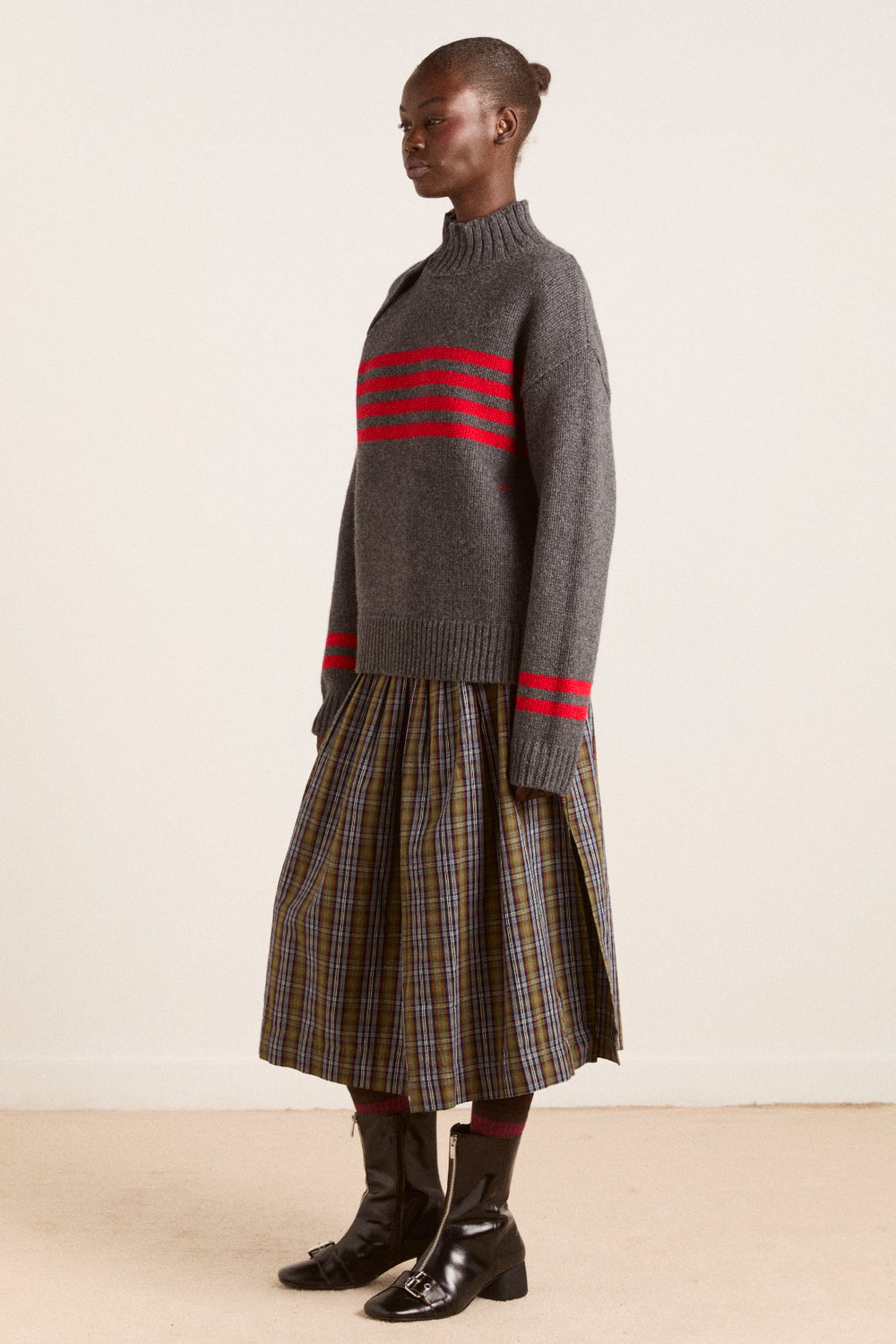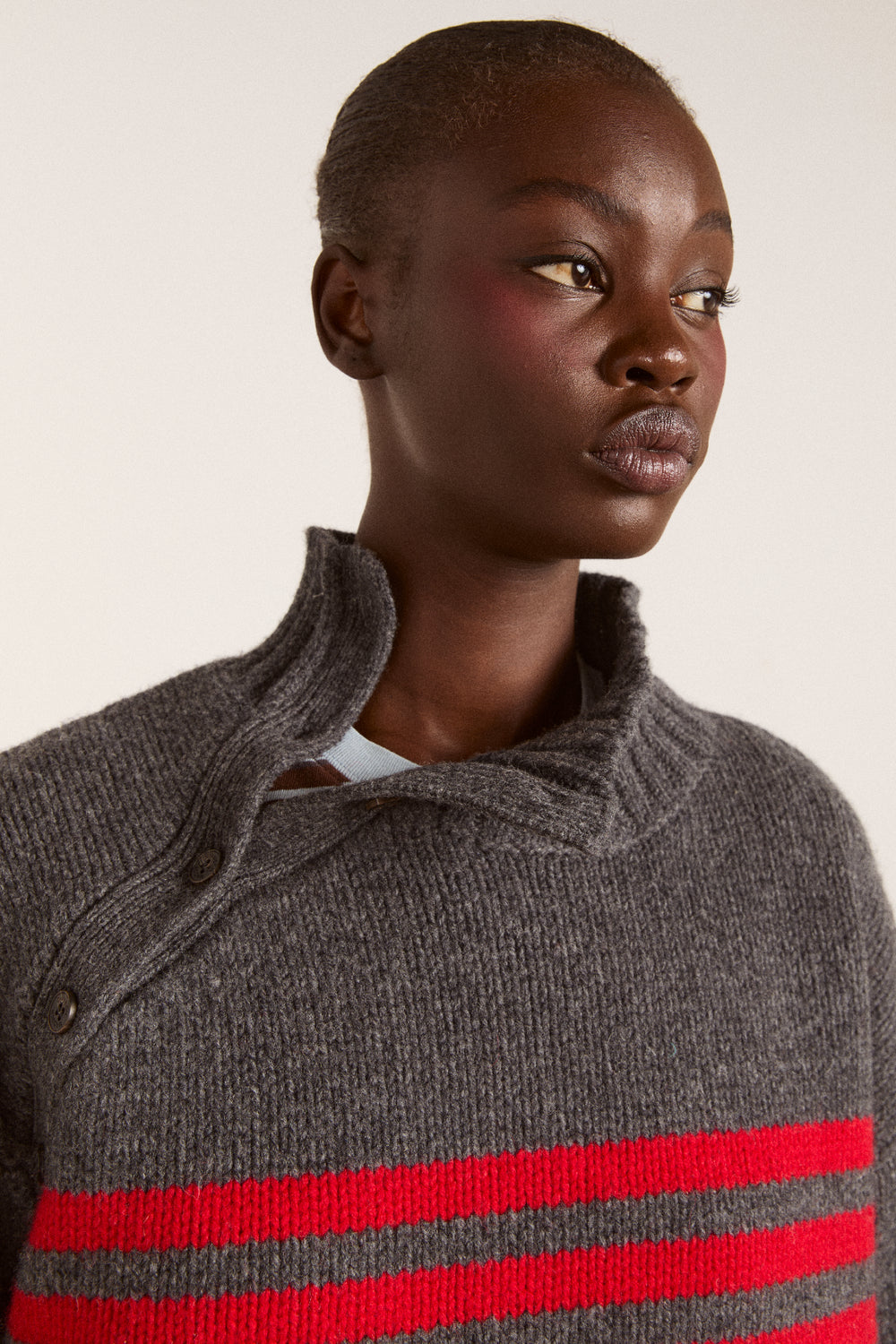 A bold reimagining of classic knitwear, the Tallulah high neck certified responsible wool standard lambswool jumper is a boxy-fit style features an asymmetric button-up collar that can be worn folded down or standing, offering styling versatility. Placement red stripes add a sharp graphic element, while a discreet “DM” embroidery on the body provides a signature detail.