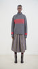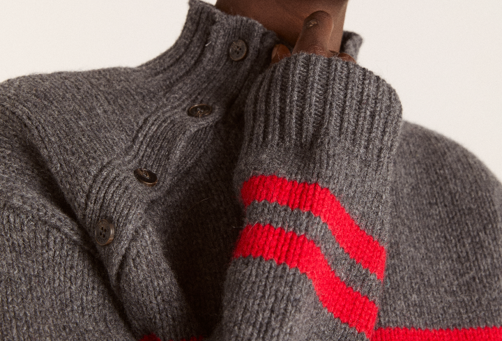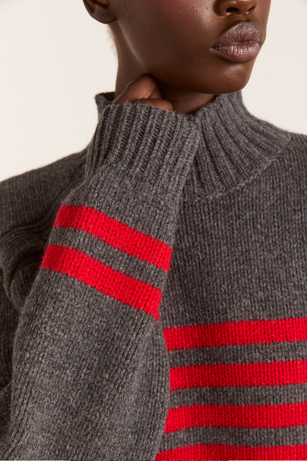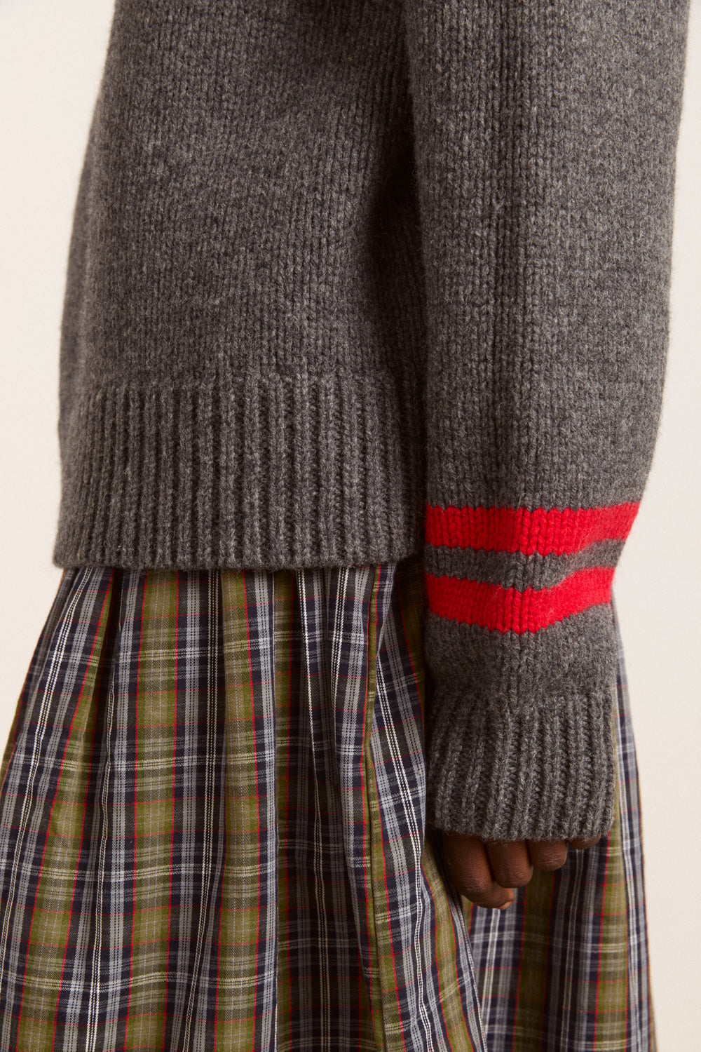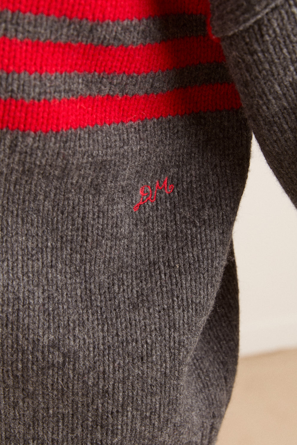 A bold reimagining of classic knitwear, the Tallulah high neck certified responsible wool standard lambswool jumper is a boxy-fit style features an asymmetric button-up collar that can be worn folded down or standing, offering styling versatility. Placement red stripes add a sharp graphic element, while a discreet “DM” embroidery on the body provides a signature detail.