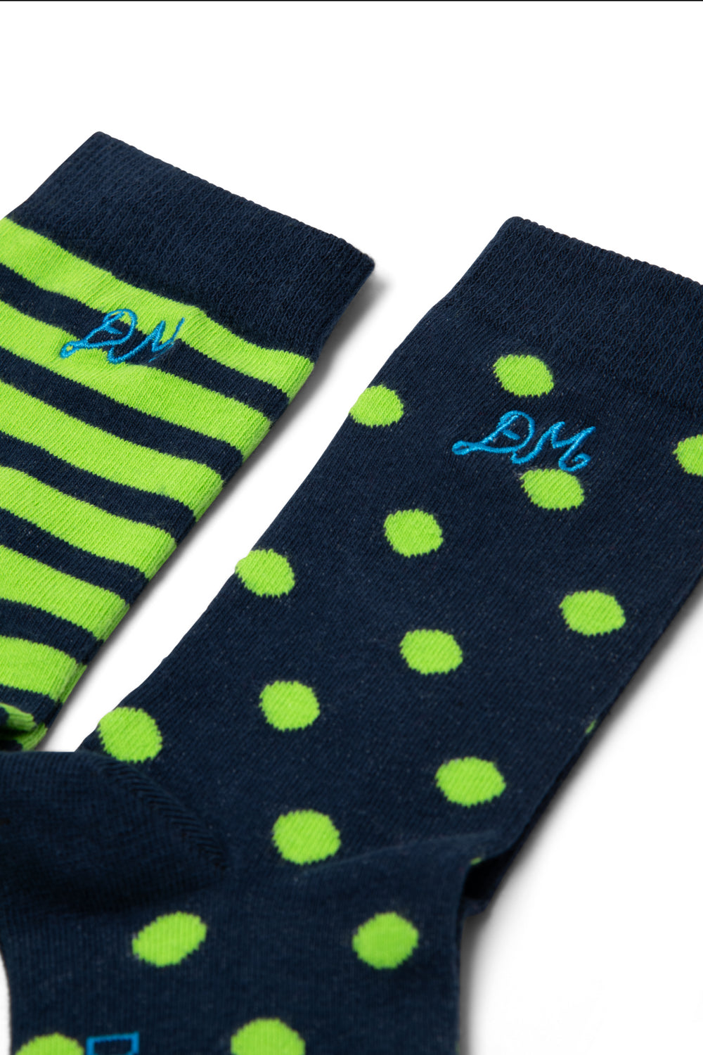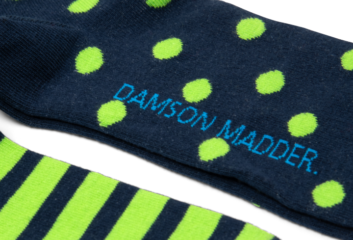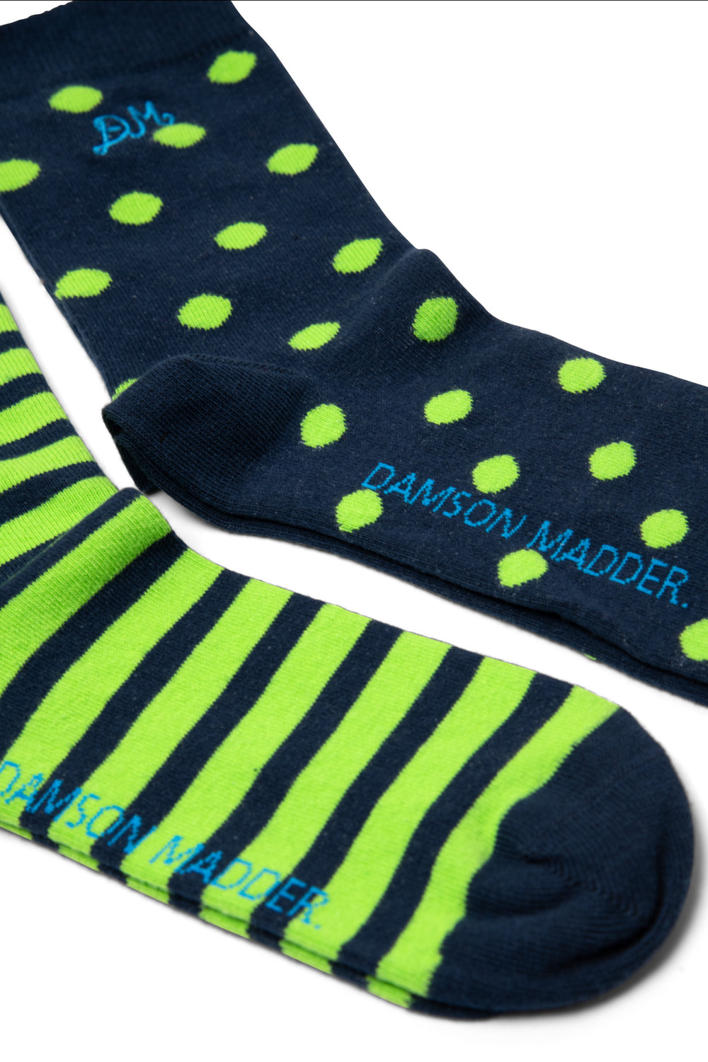 This 2 pack of calf-length socks in polka dot and stripe comes with our signature blue DM embroidery and a comfy organic cotton blend, ready to add a little pattern love to every outfit.