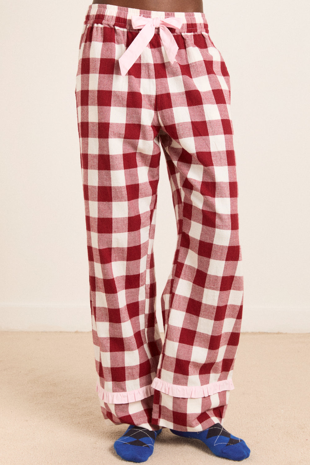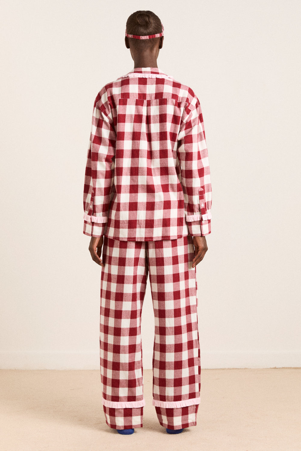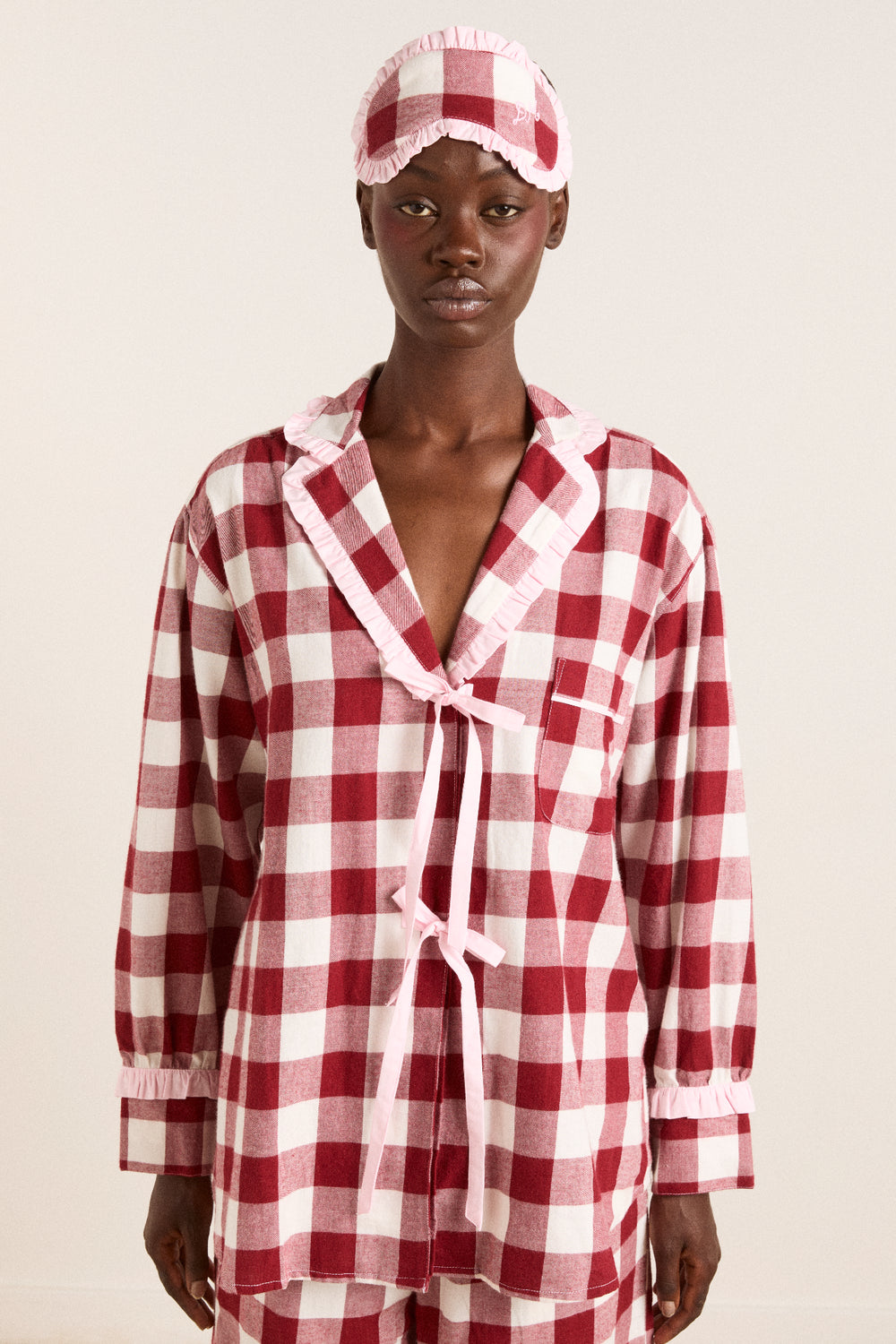 An oversized burgundy gingham adorns our Antonella pyjama set, featuring a classic button up shirt, tie waist detailing and frill trims. Complete with fabric storage bag.