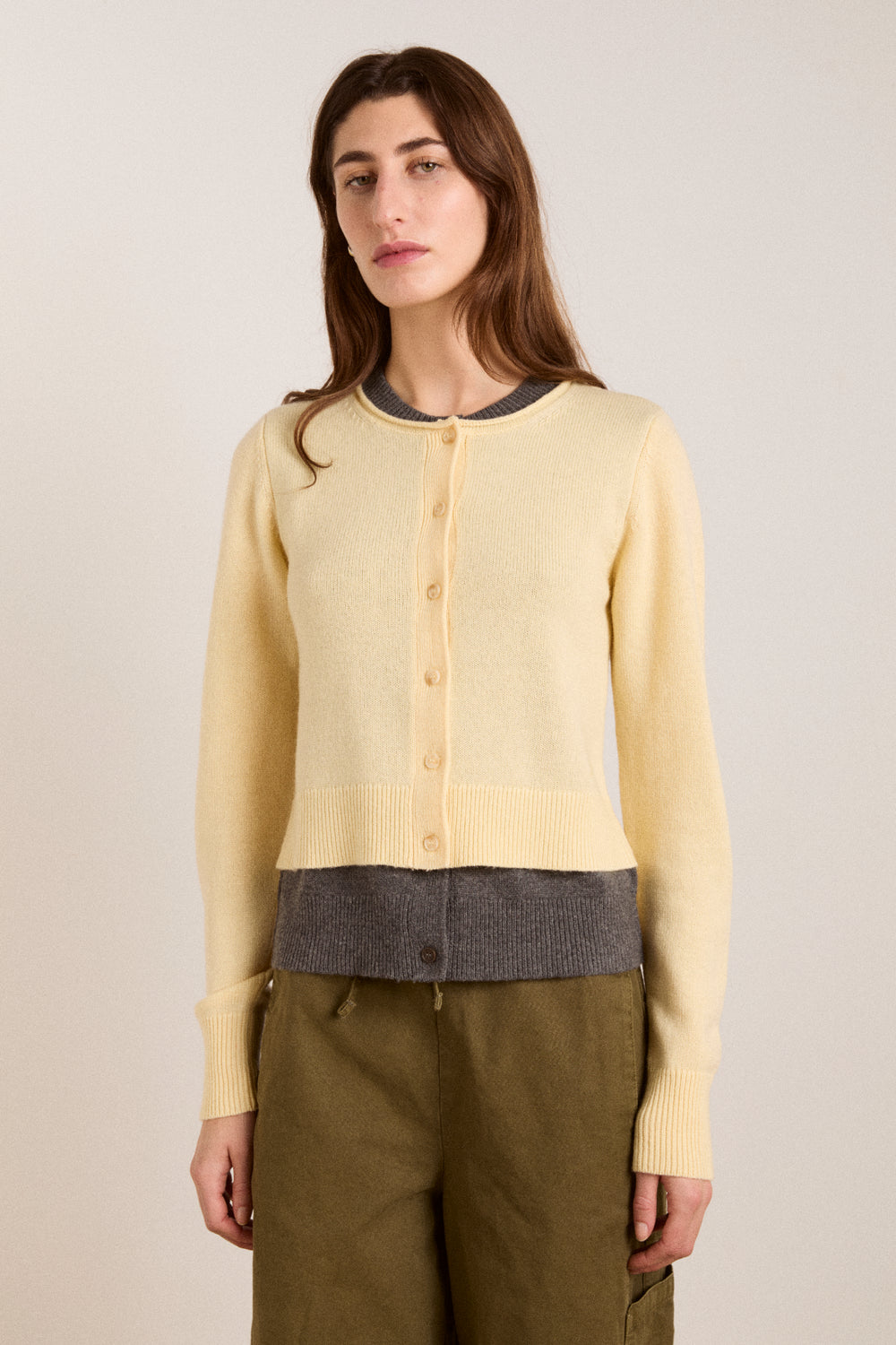 A soft cardigan designed with a double-layered finish for added interest and warmth. Crafted from a luxurious Responsible Wool Standard wool and cashmere blend, it features a button through fastening and a versatile design that can be styled multiple ways. An easy layering piece in a butter and grey colour way that works year round.
