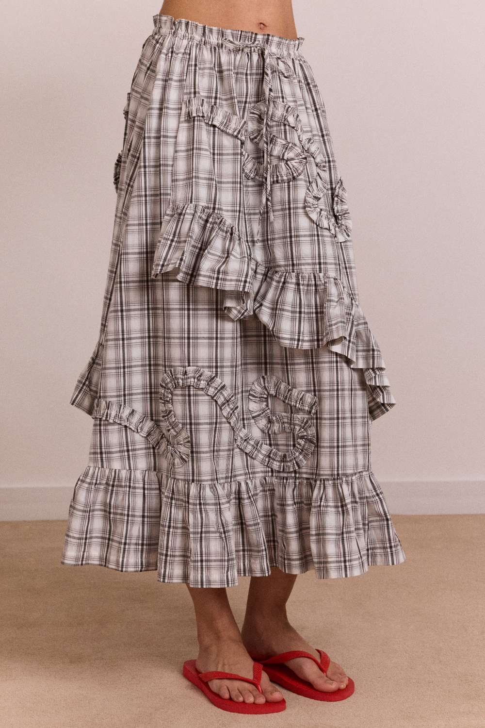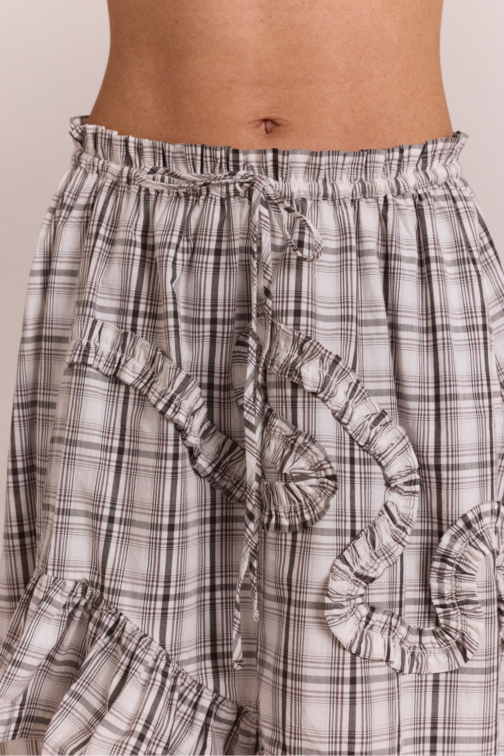A playful take on a classic check. This midi skirt features swirl ruffle detailing and an asymmetric double-layer panel for soft movement and shape. Designed with an elasticated waist, functional tie and side seam pockets for all-day comfort. Crafted from 100% Organic Cotton. Pair with the matching shirt for the full look.