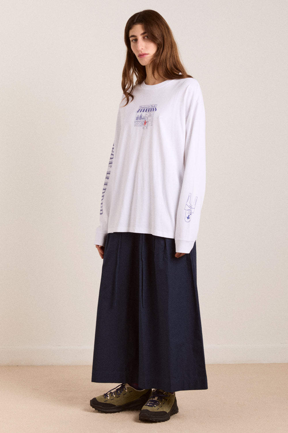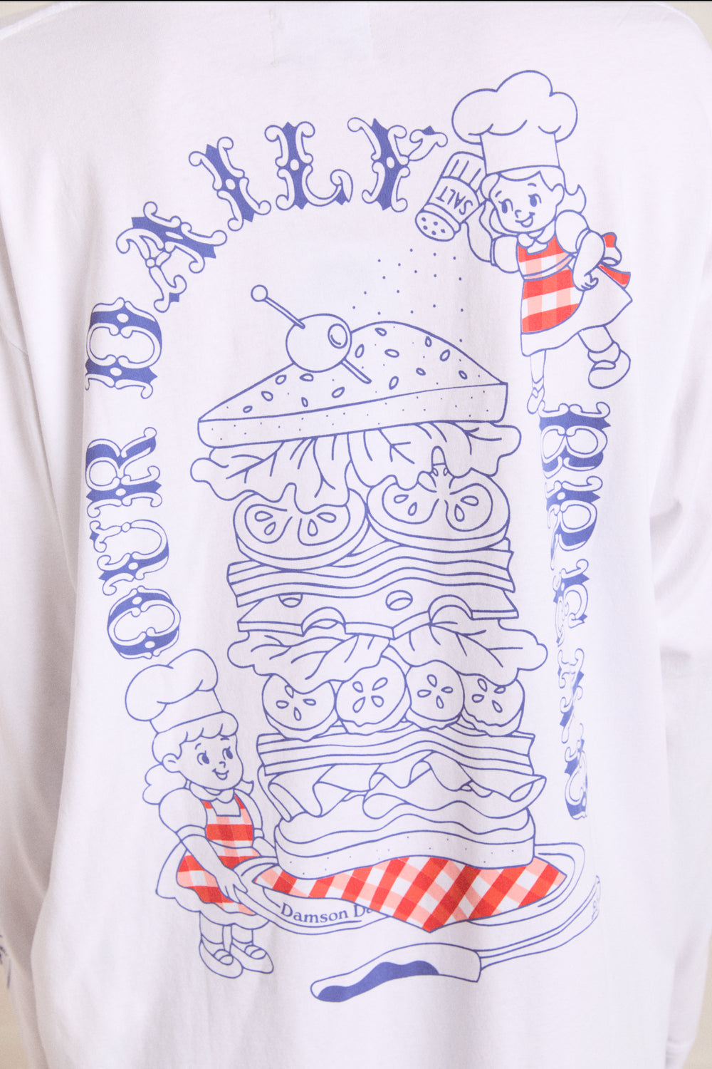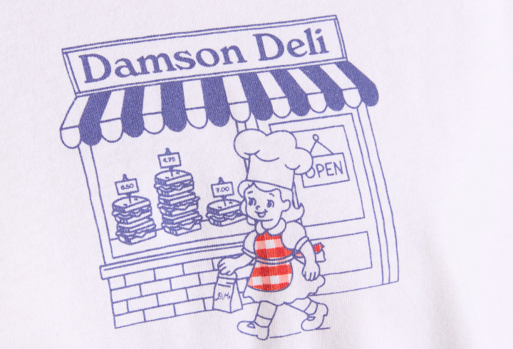 Crafted from 100% organic cotton, our Damson Deli Tee is the go-to piece you'll reach for every day. Designed with a relaxed, oversized fit, this tee features thoughtfully placed graphic prints on the front and back for a playful touch.