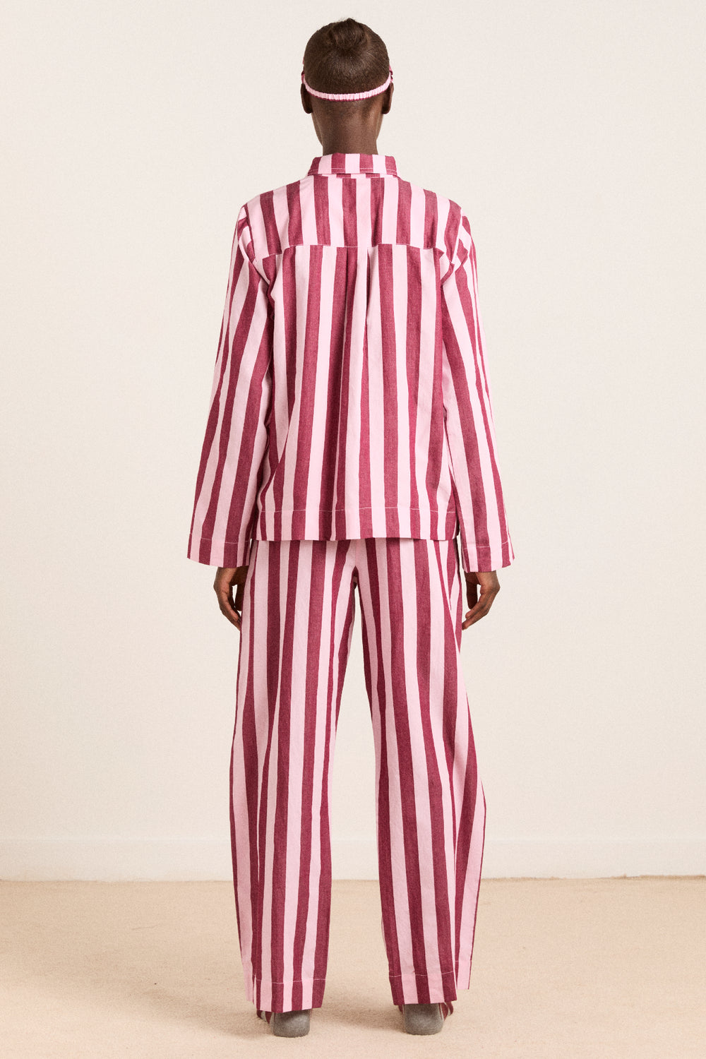 Introducing the Florie, the newest member of our nightwear range. The Florie boasts a classic button up front and collar, two large front pockets and all all over pink & burgundy stripe. Complete with fabric storage bag.