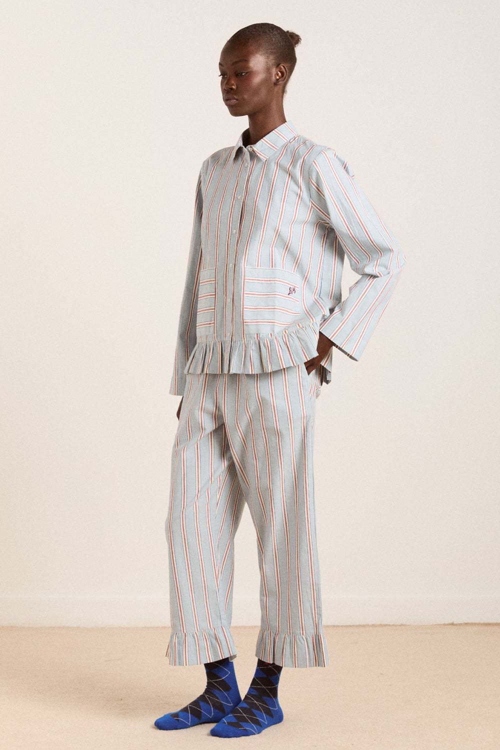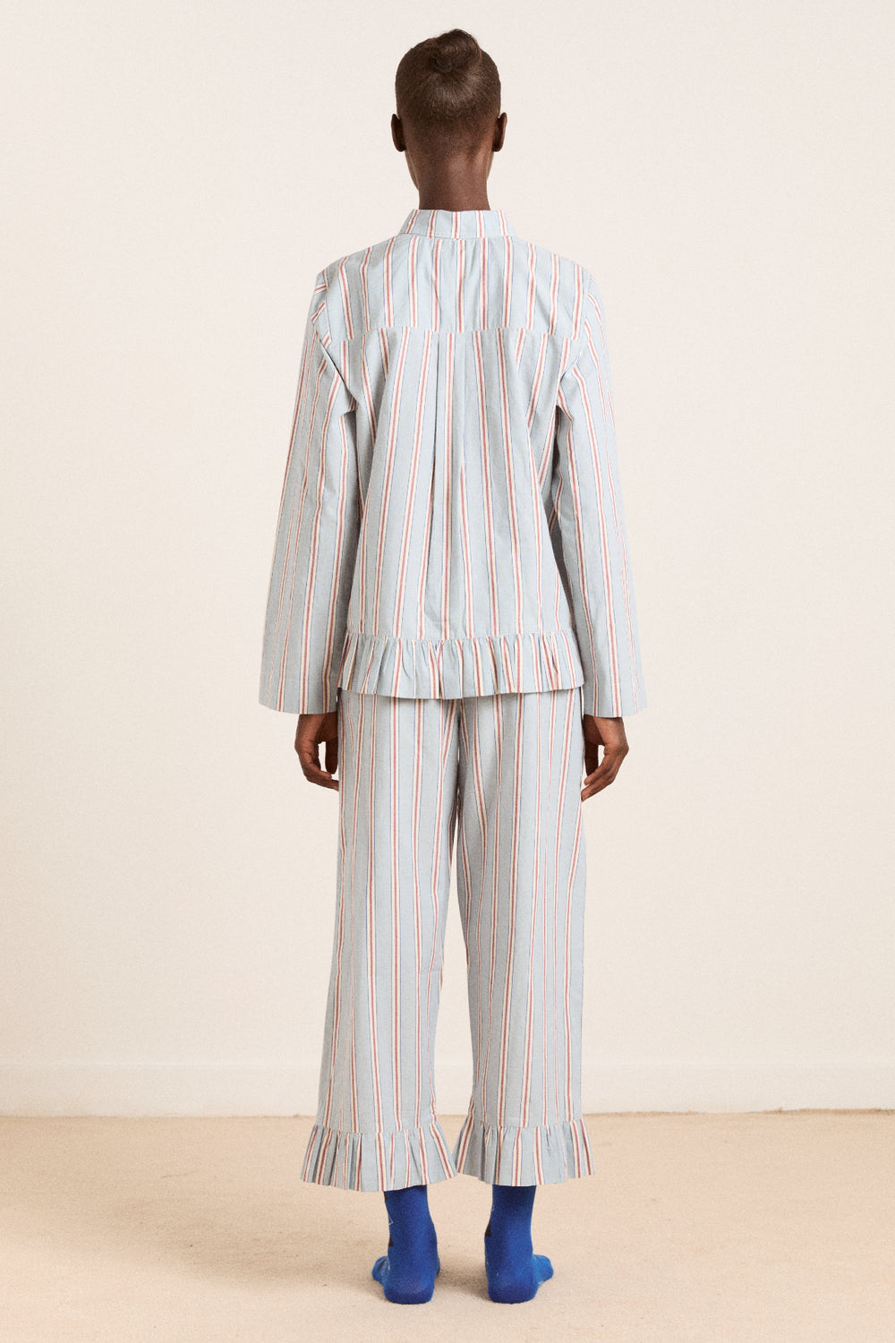 Where function meets frill: introducing the Florie in blue and burgundy stripe. Crafted from 100% organic cotton, this breathable, ultra-comfortable set proves you never have to compromise on style. Complete with fabric storage bag.
