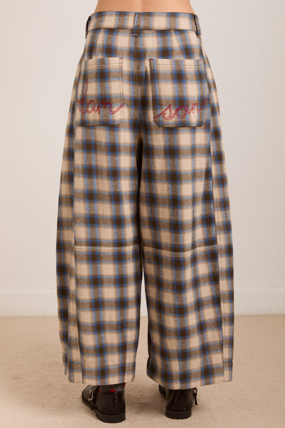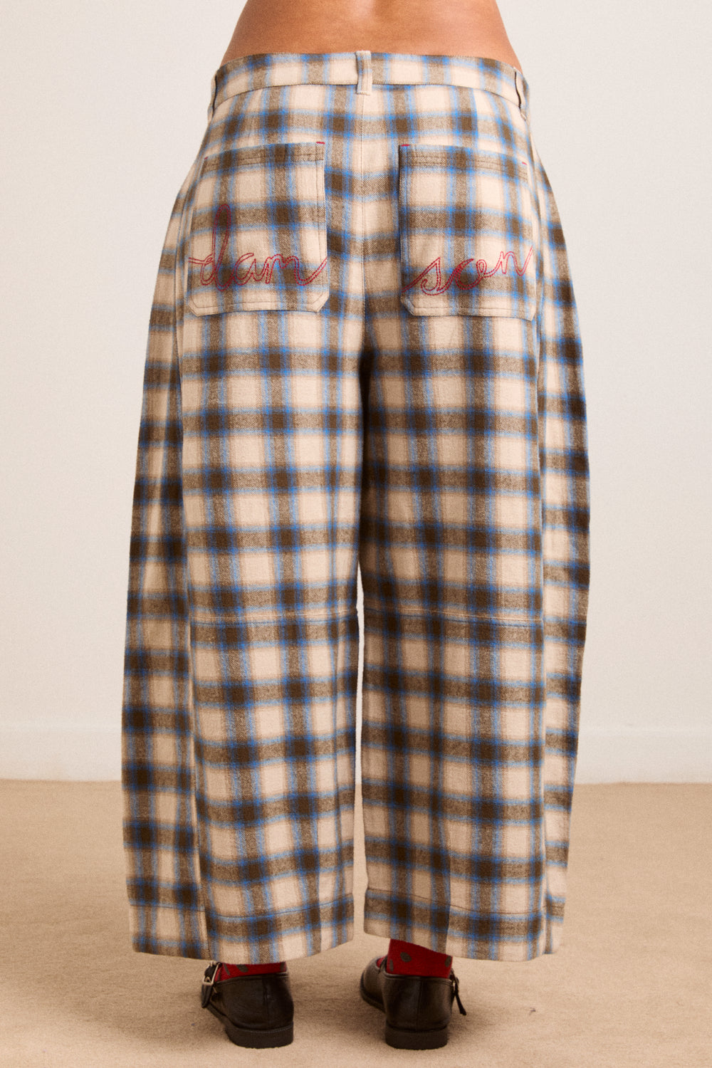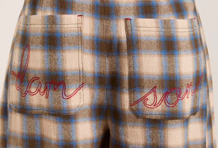 A Damson Madder favourite refreshed in a new colour way, the Mara Trouser features a modern barrel leg with a flattering mid rise. Cut from softly brushed, yarn-dyed check fabric, it’s finished with tailored details including front pleats, folded pockets with horn buttons and signature red DM embroidery at the back.