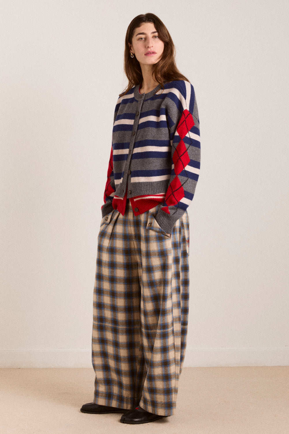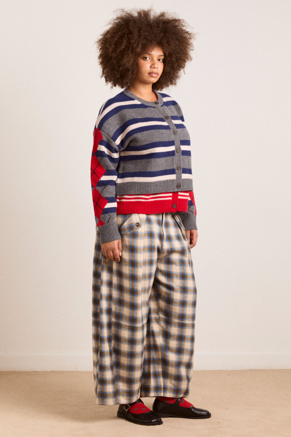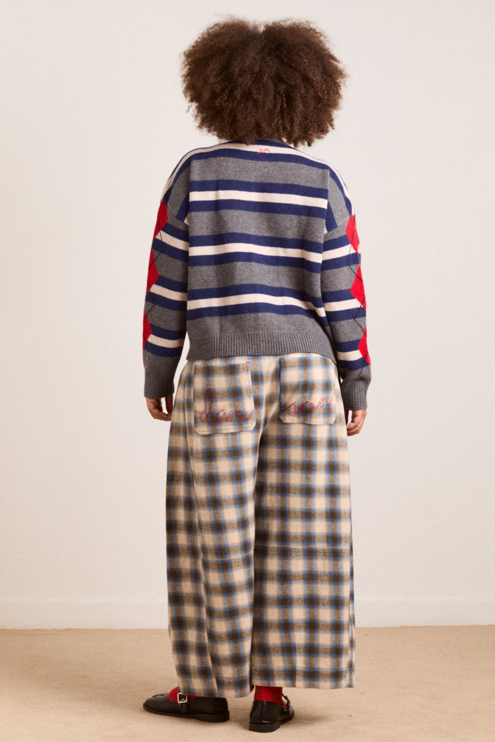A Damson Madder favourite refreshed in a new colour way, the Mara Trouser features a modern barrel leg with a flattering mid rise. Cut from softly brushed, yarn-dyed check fabric, it’s finished with tailored details including front pleats, folded pockets with horn buttons and signature red DM embroidery at the back.