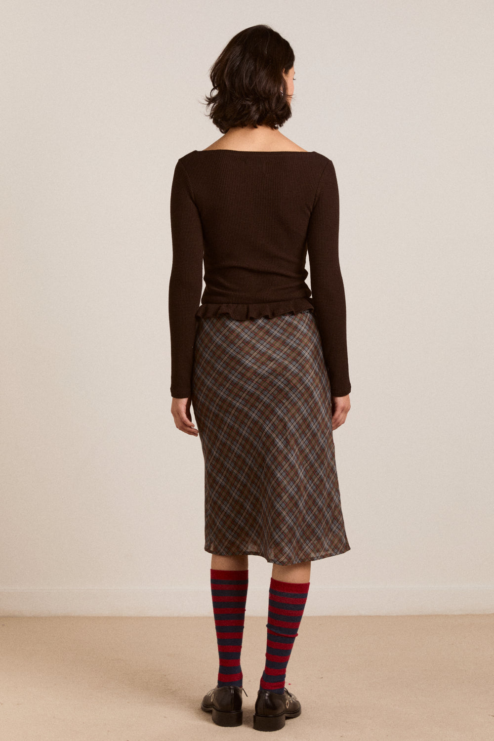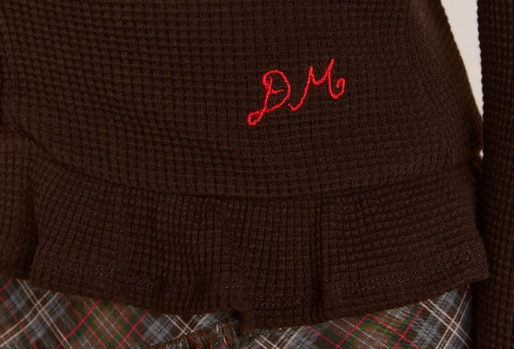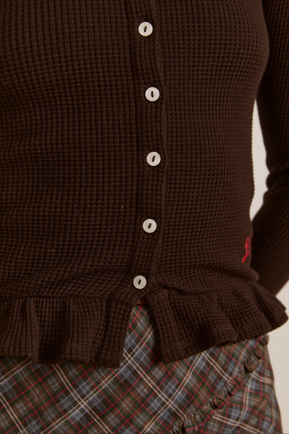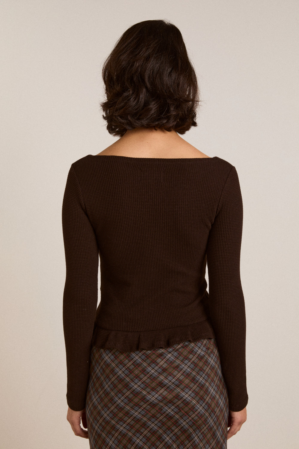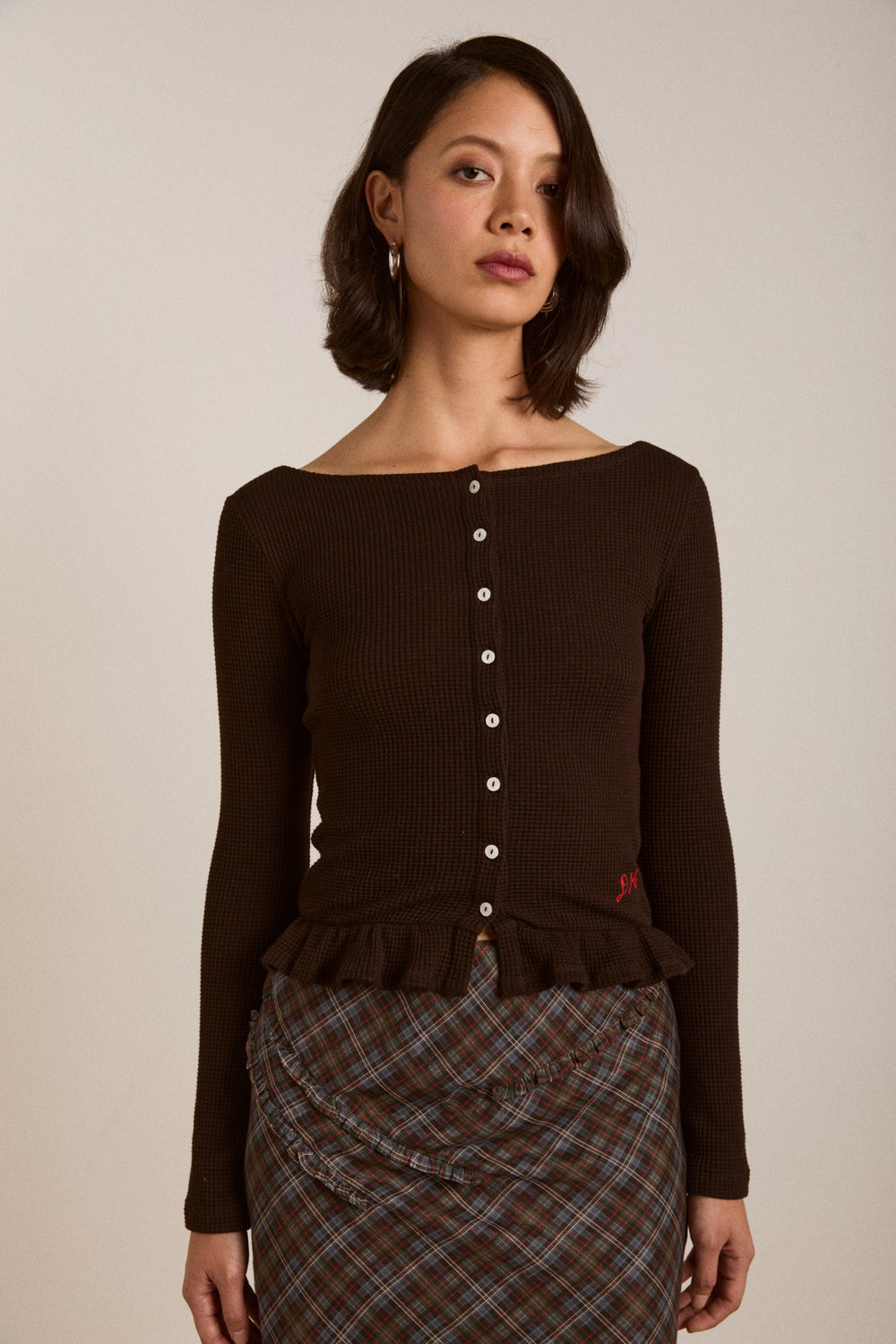 Crafted from soft, waffle fabric, this chocolate brown top is your go-to for cooler days. Designed with a flattering boat neckline and long sleeves, it’s finished with a frill hem detail that adds a feminine touch. Faux shell buttons down the front elevate the look. Made from 95% organic cotton and 5% elastane, it offers just the right amount of stretch. Thoughtfully designed in London and made in Türkiye.