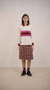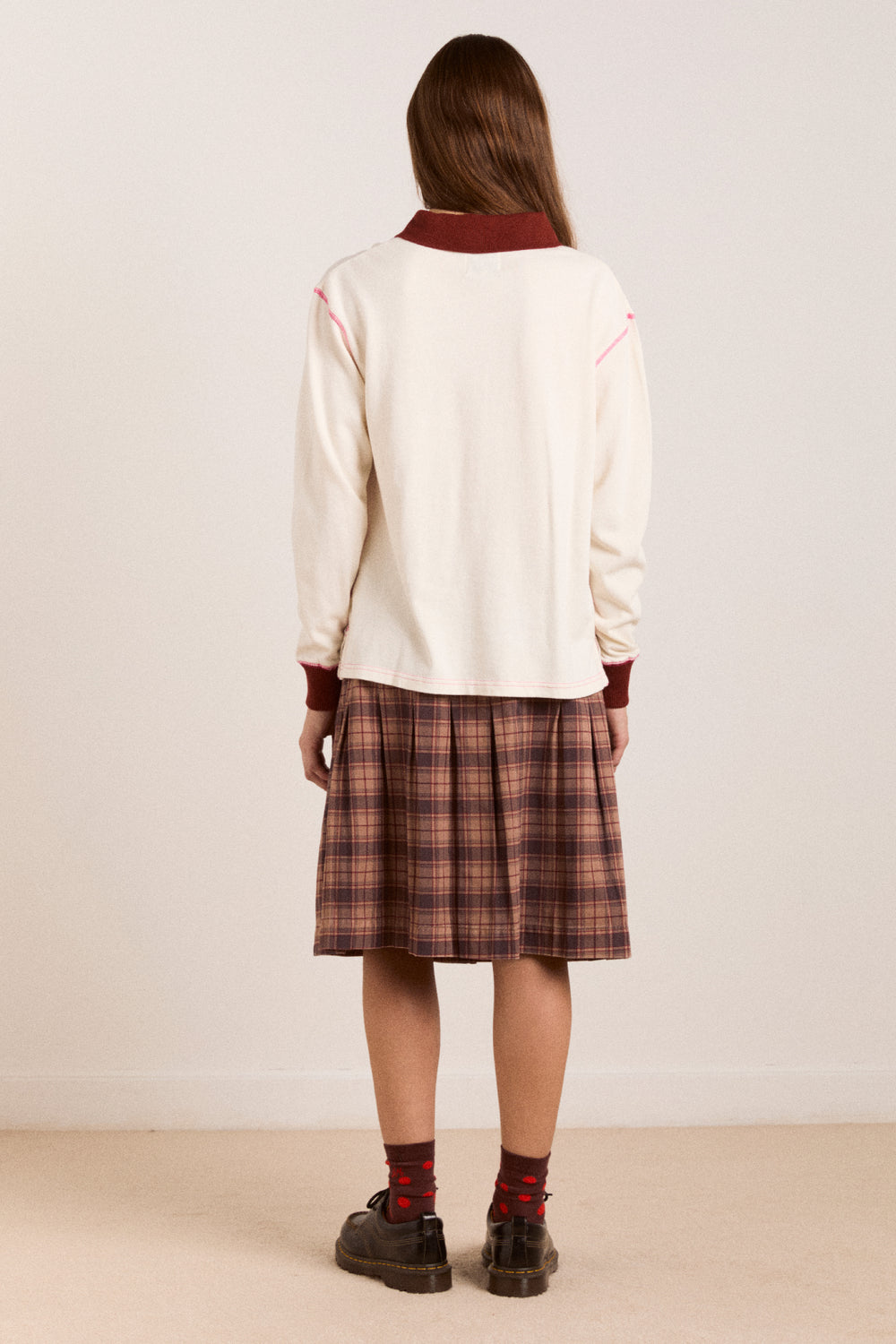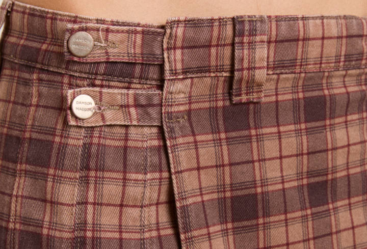 A modern wrap over kilt in a classic tan check, designed for everyday wear with a polished edge. Featuring soft pleats for easy movement, a flat wrap over front, and secure internal button fastening, finished with statement shank button detailing. Subtle DM embroidery adds a considered touch. Cut to a knee length with a comfortable regular fit.